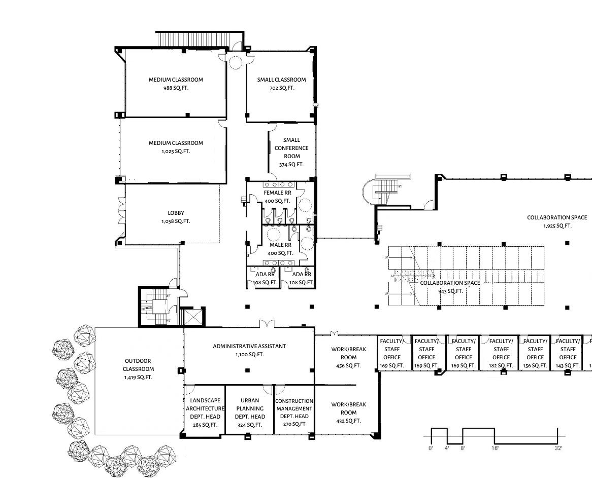 Modoc Hall’s main level includes Administrative offices, faculty offices, classrooms, and various collaboration spaces to facilitate the collaboration between faculty and students.