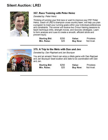 Silent Auction: LREI 357. Race Training with Peter Heinz Donated by: Peter Heinz Thinking of running your first race or want to improve your PR? Peter Heinz, coach of LREI's champion cross country team, will help you plan a program to meet your running goals within your individual preferences and constraints. The winner will receive two 2-hour training sessions to teach technique drills, strength moves, and recovery strategies. Learn to form analysis and cues to create a smooth, efficient stride and prevent injury. Starting Bid: Min. Raise: