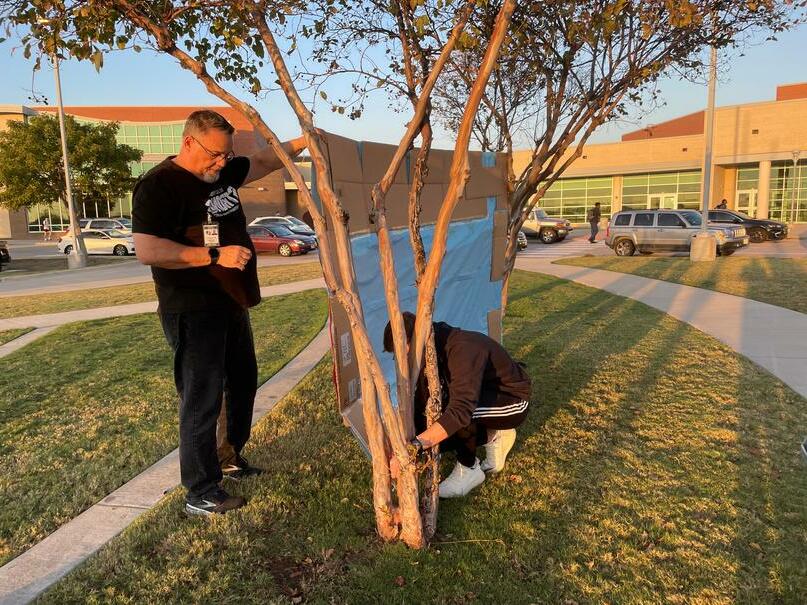 Officers, John and Zoe working with fellow key clubbers to lay out stripes on the U.S. flag banner