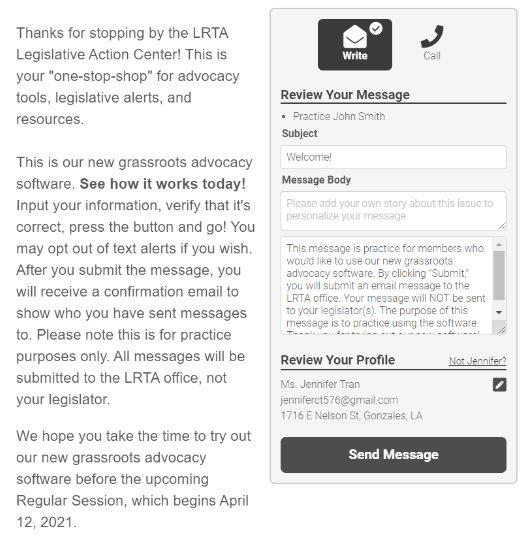 HowdoIknowmymessagewentthrough? VoterVoicewillsendaconfirmationemailafteryousendyour messages.Theconfirmationemailmayarriveafewminutesafteryou completedtheaction.Theemailwillconfirmyoucontactedyour legislatorsandgiveyoualistofwhomyoucontacted. DoIhavetouseVoterVoicetocompletecallstoaction? LRTAisofferingVoterVoicetoourmembersasaconvenientoptionfor contactingtheirlegislatorsormembersofCongress.LRTAwillalways encouragememberstowritelettersandemailsandmakephonecalls andwillprovideresourcesformemberstouseinouremails. VoterVoiceallowsmemberstoquicklyandeasilycompletecallsto actionandcontacttheirlegislators.