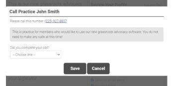 HowtoUsetheVoterVoiceCallFeature: 1.SeethestepsfromHowtoUsetheVoterVoiceMessageFeatureforinputtingor verifyingyourinformation. 2.Atthetopofthepage,clickonthe“Call”buttonorphoneicon.Clickingonthisbutton willnotactuallycalltheperson. 3.Youwillseethenamesandnumbersofthelegislatorsyouneedtocallalongwith talkingpointstohelpguideyourconversation. 4.Onceyouarecomplete,youmayselectwhichactionyoutook(Yes,Ispokewith someone;Yes,Ileftamessage;No,Ididnotspeakwithanyone)thoughitisnot necessary. CallButton Suggested TalkingPoints