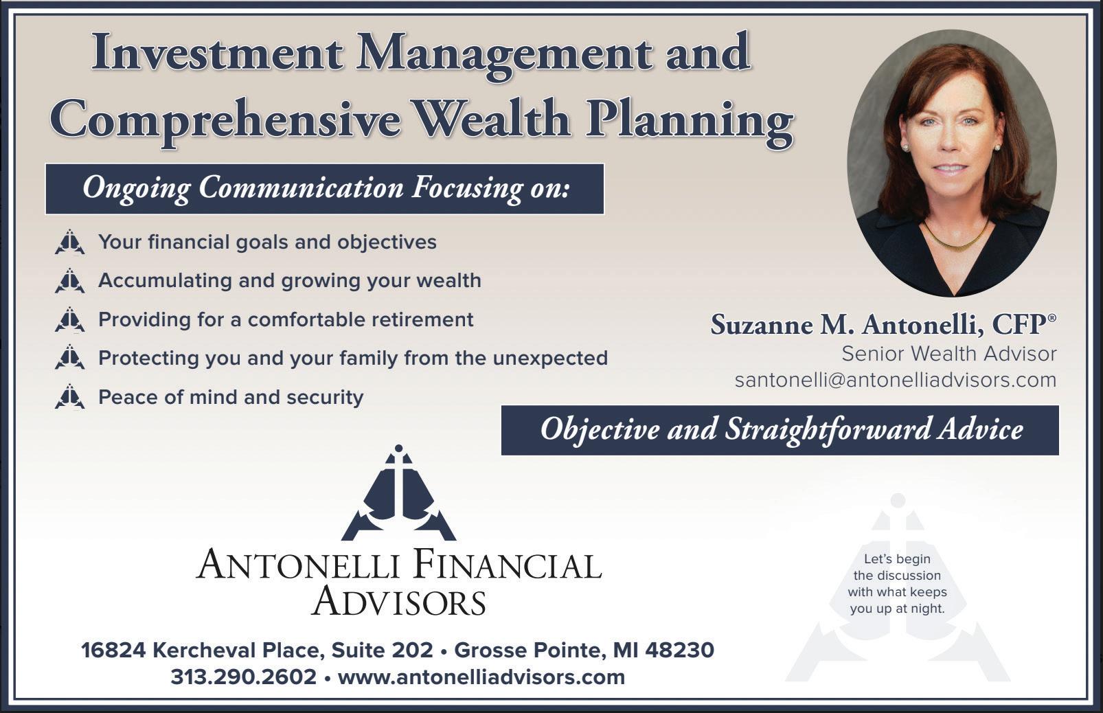 16 | ANTONELLI FINANCIAL ADVISORS Investment Management and Comprehensive Wealth Planning Ongoing Communication Focusing on: Objective and Straighforward Advice Your nancial goals and objectives Accumulating and growing your wealth Providing for a comfortable retirement Protecting you and your family from the unexpected Peace of mind and security 16824 Kercheval Place, Suite 202 . Grosse Point, MI 48230 313.290.2602 . www.antonelliadvisors.com DELIVERING COMPLEX PROGRAMS WITH VELOCITY & RIGOROUS QUALITY. We believe in a better way. We empower others to grow, rise and give back. Our commitment to our talent and communities allows us to accelerate positive change in the world. This translates to unparalleled velocity and quality for your most complex assembly programs. dmsna.com | 313.243.0700 Grosse Pointe, MI 48230