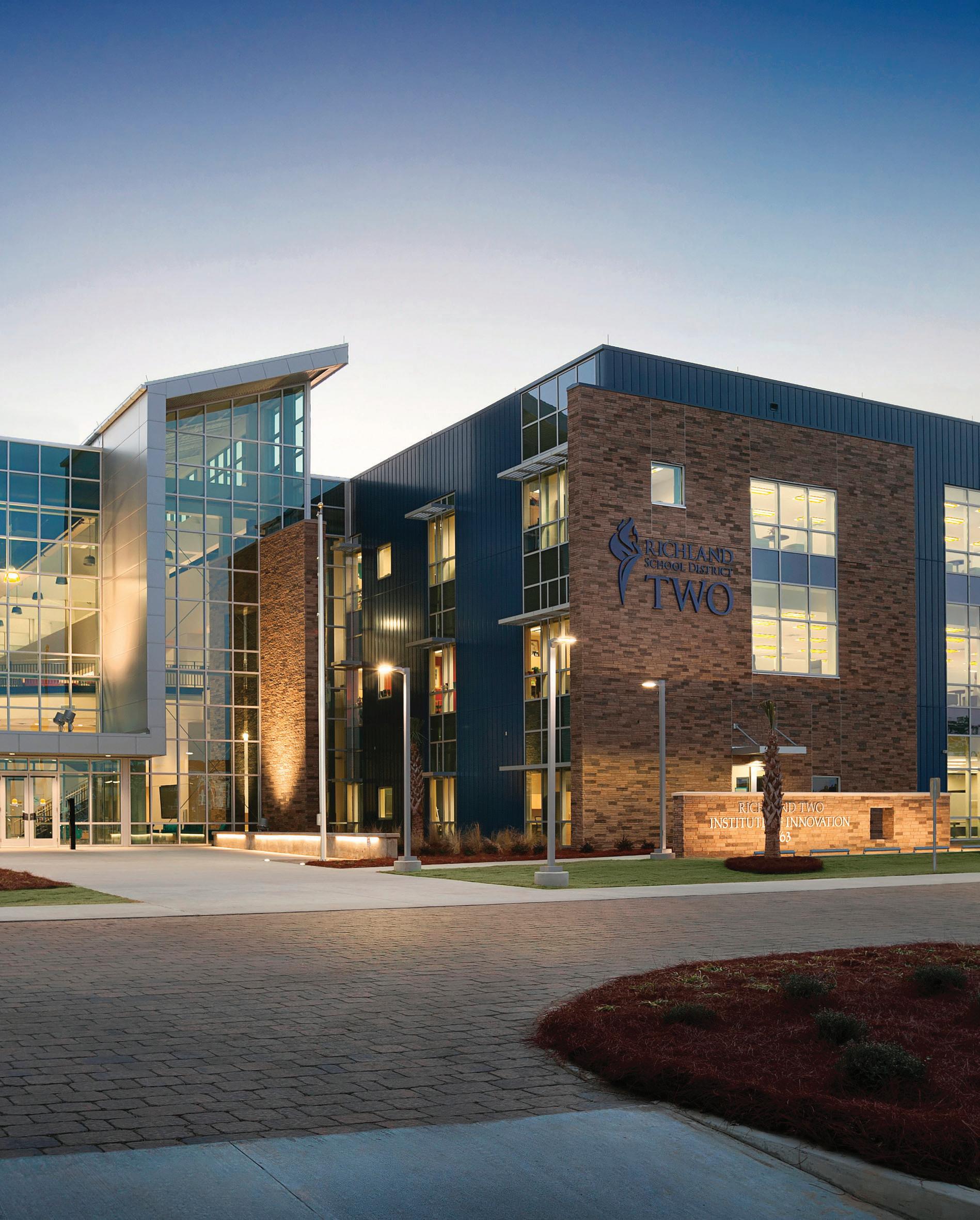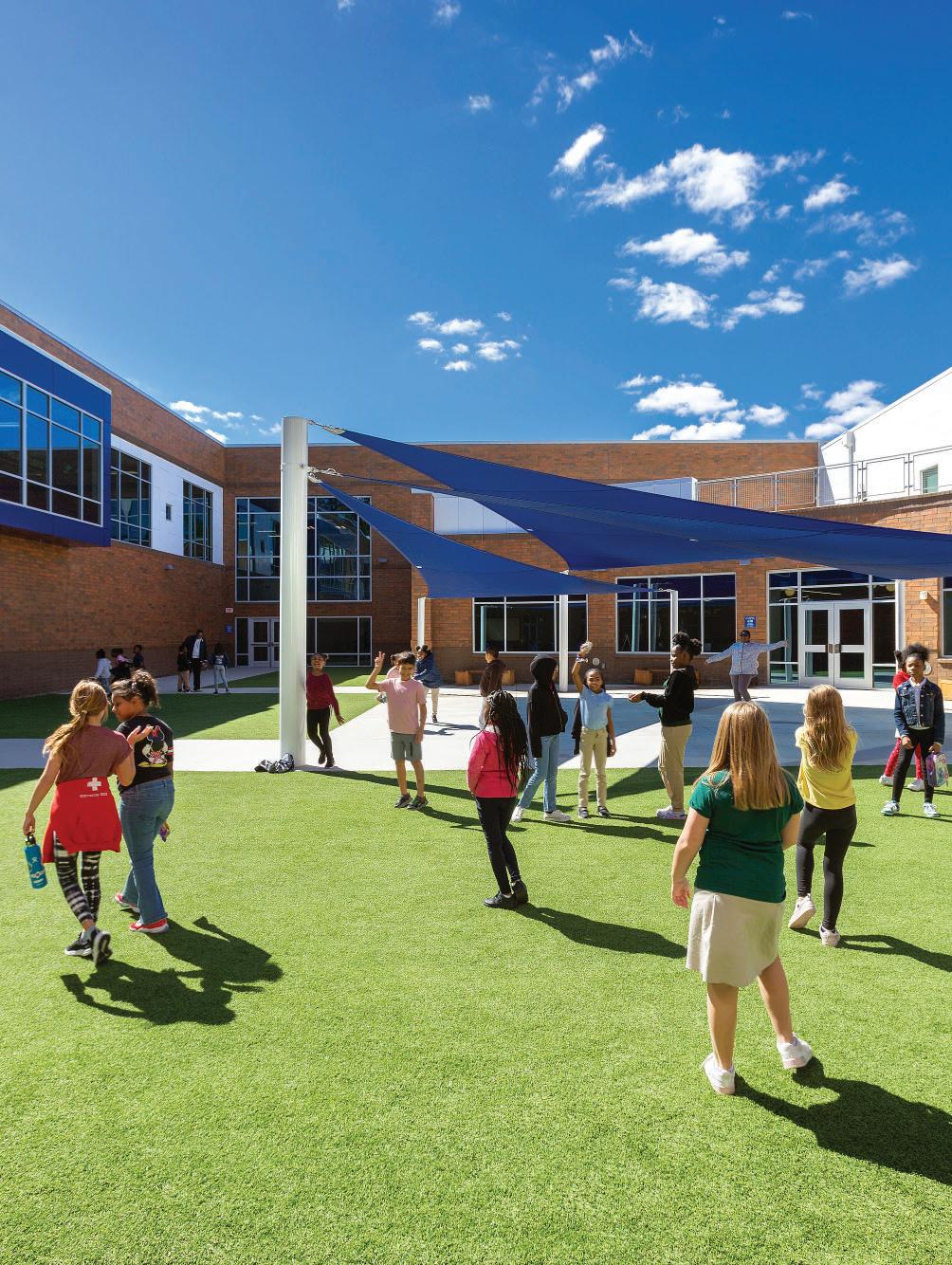 Lighting: Adequate lighting improves visibility and safety during early morning and evening hours. This school uses site and building highefficiency LED mounted lighting, and the light levels meet Illuminating Engineering Society of North America (IES) standards.