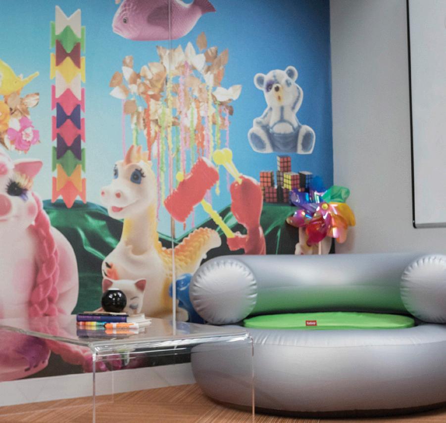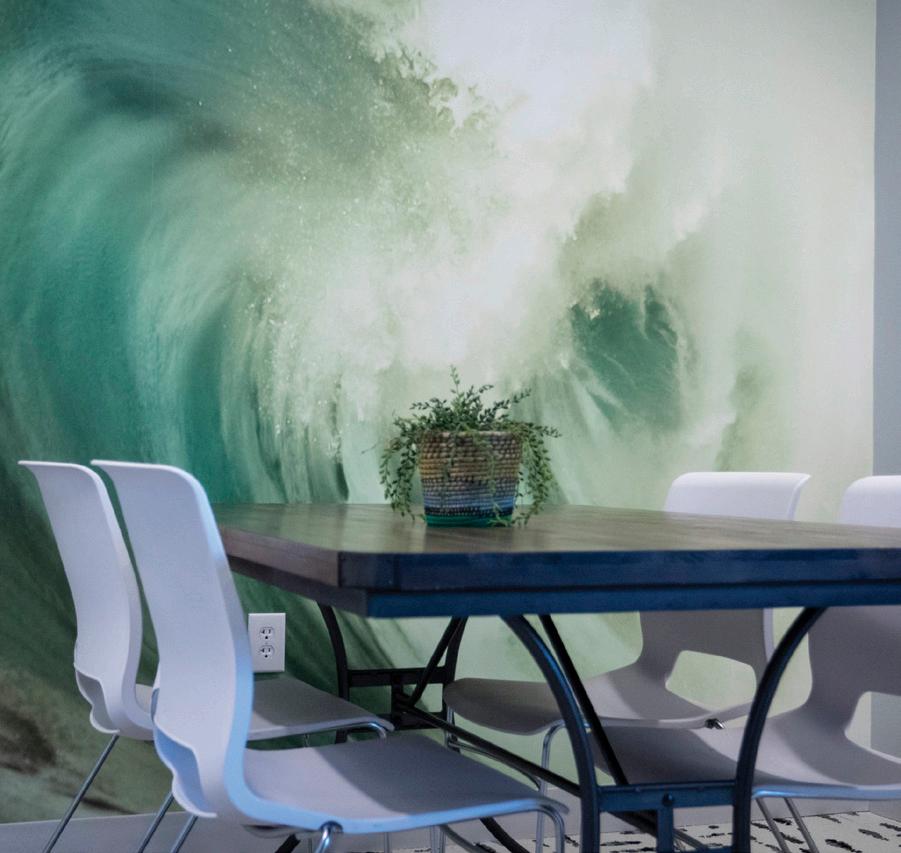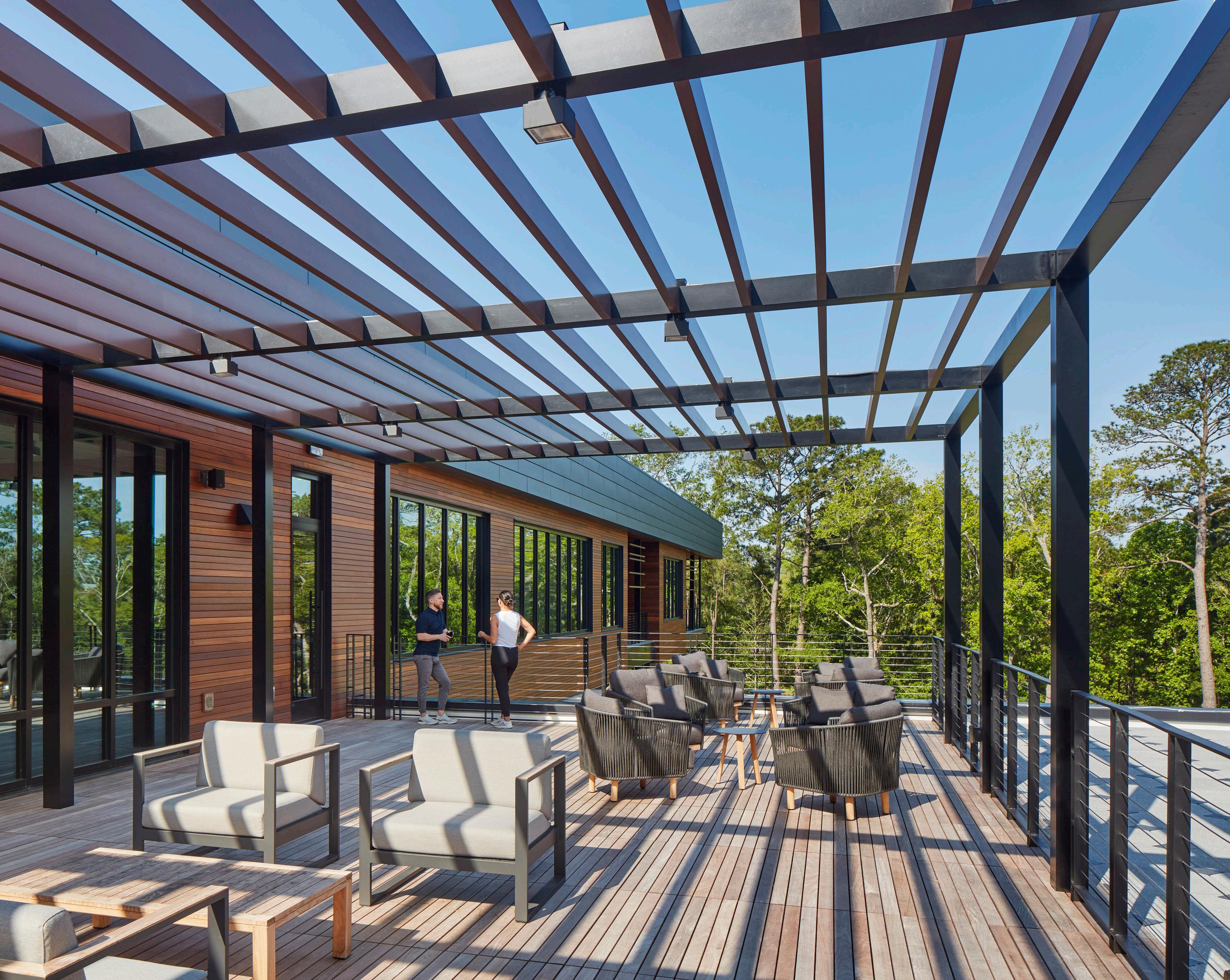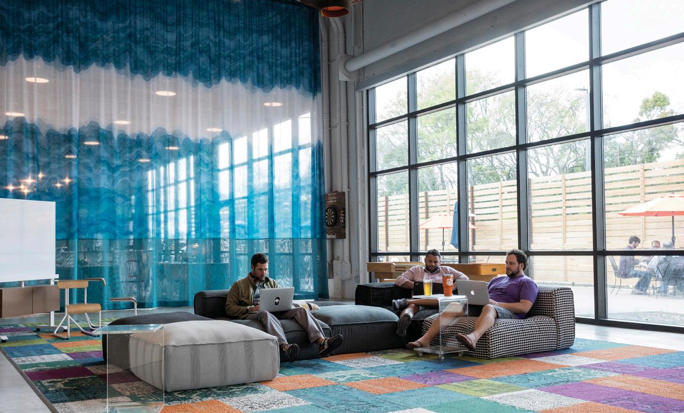 The original structure featured expansive high-bay space but offered little visual or spatial definition. A weathering steel and corrugated metal exterior, galvanized steel canopy, and edgy balance of sleek and gritty materials integrate with exposed structure to create a contemporary workplace vibe. Large curtainwall inserts and skylights bring natural light deep into the interior, while punches of color and whimsical wallcoverings add visual interest to the space. `Custom furnishings made from reclaimed docks and barns, refurbished white metal lamps, and artwork tailored to the space all contribute to the company’s unique energy. A light filled sunken living room serves as a multiuse space for relaxation or meetings, and a company bar is a popular late-day meeting spot. Outdoor amenities include a beer garden, dog run, great lawn, and courtyards.