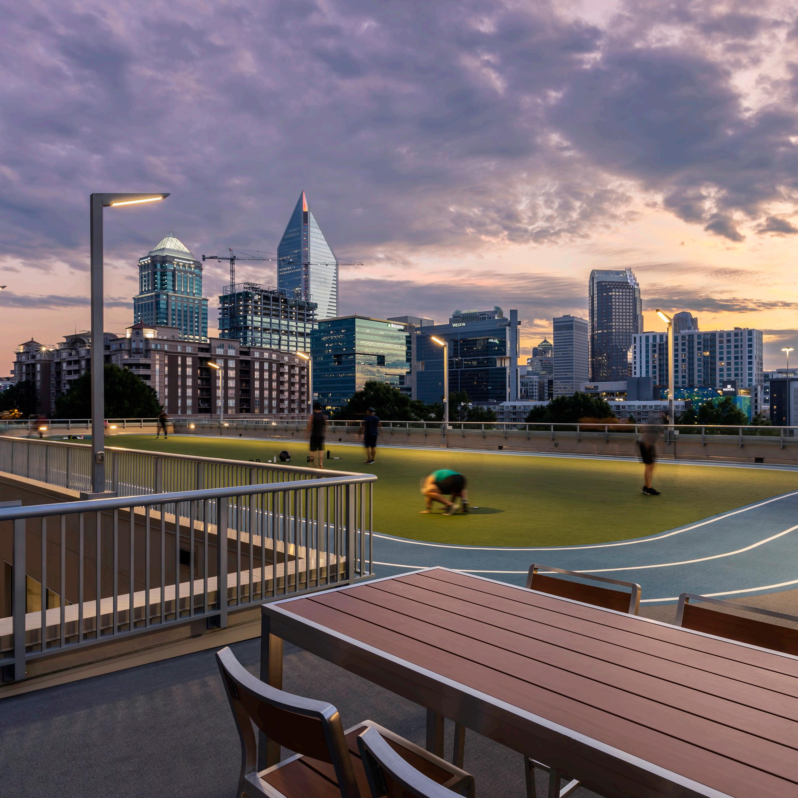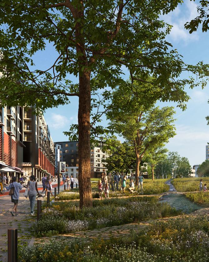 Strategic greenspaces integrated into the project in the form of green buffers, pocket parks, and even frequent parking lot tree wells can help to reduce pervious paving for stormwater management and minimize the heat island effect. Greenspace contributes to health and wellness and, when strategically programmed, can be a tool for building community resilience and outdoor respite spaces that will be critical in the wake of a disaster.