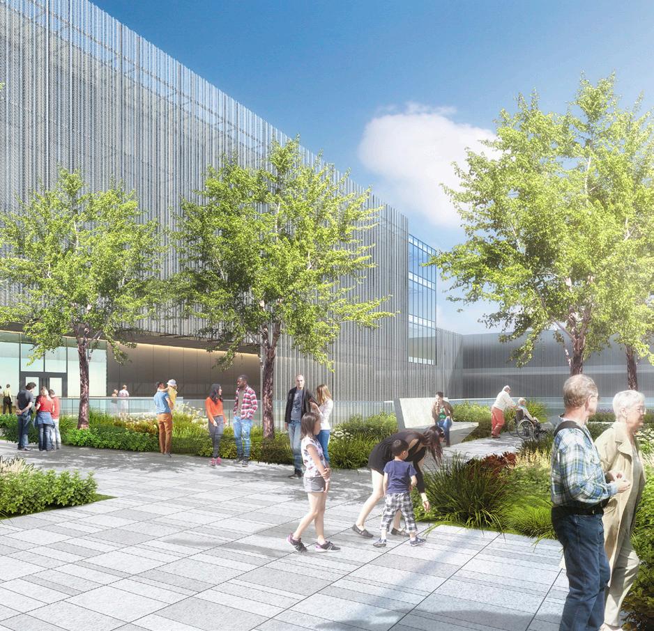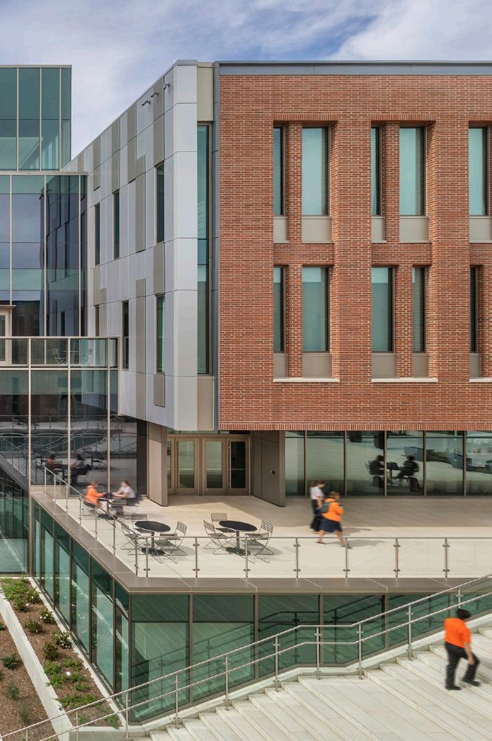 In addition to being impact resistant, the façade doubles as a key strategy for energy performance, identity, and patient experience. The perforated screen functions in various configurations supporting green roofs, fritted glazing, recessed glazing, and R-40 wall construction depending on location. The screens also support privacy, control glare, provide a connection to nature, and eliminate the need for blinds.