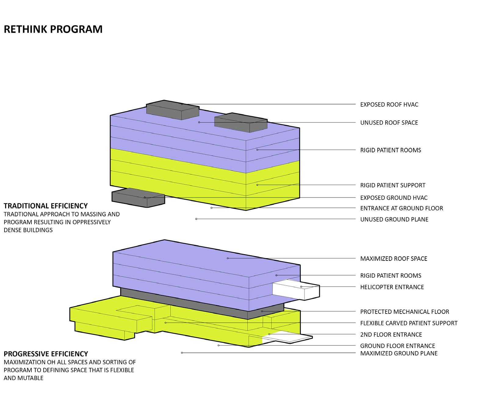 down; three entry points at ground level, the second-story bridge, and the helipad; and greatly reduced energy loads, which allow the building to operate much longer on solar power than a typical hospital could. High performance, right-sized mechanical systems are located on a protected floor instead of exposed on a rooftop. The resulting concept allows 50% more natural light and reduces energy use by 50% over a typical hospital design.