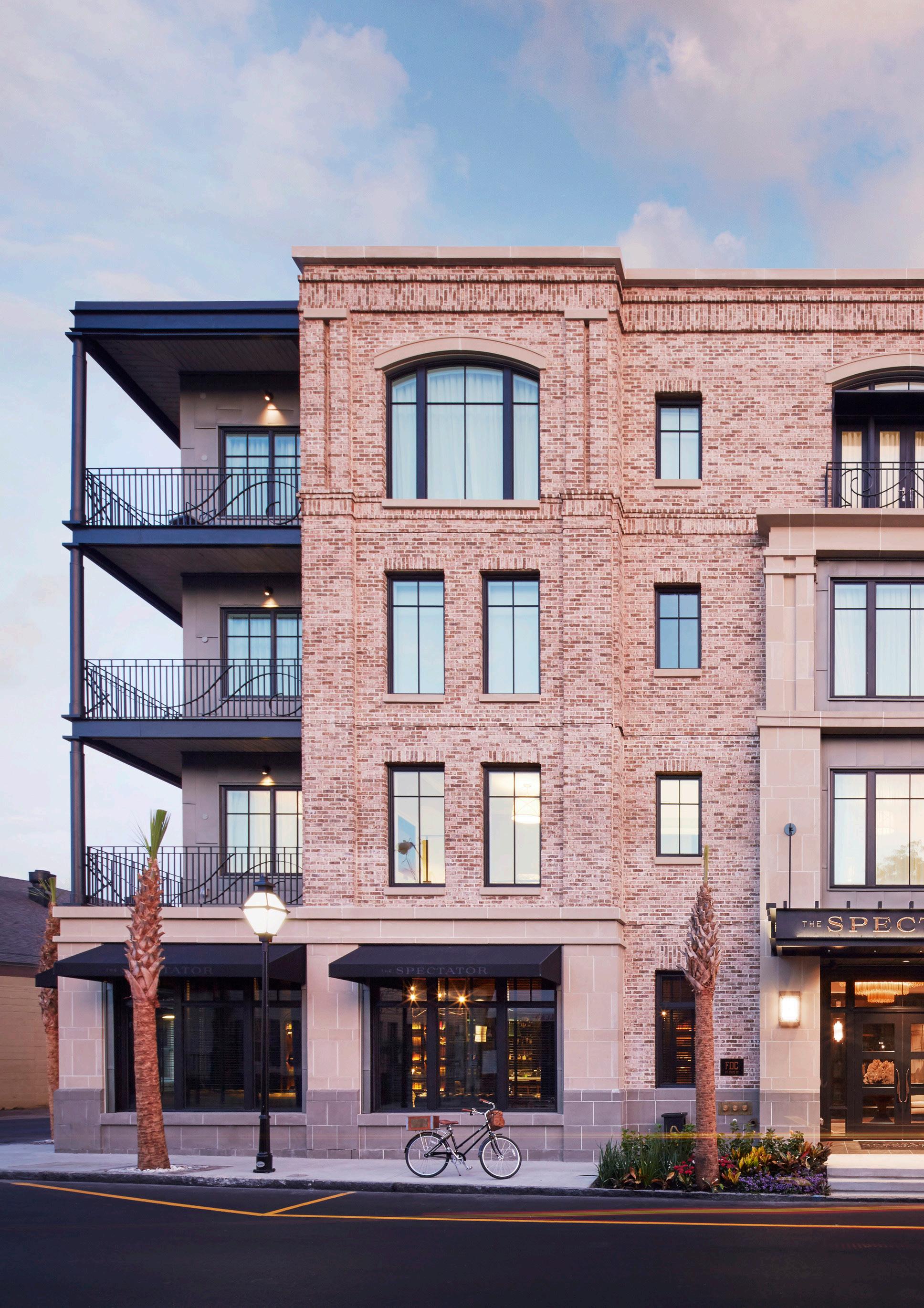 The wrought iron railings nod to the French Quarter’s historic aesthetic. Balconies carved out of the prominent corner provide a sense of lightness and transparency reminiscent of Charleston’s famous side porch while framing views of St. Philips Church.