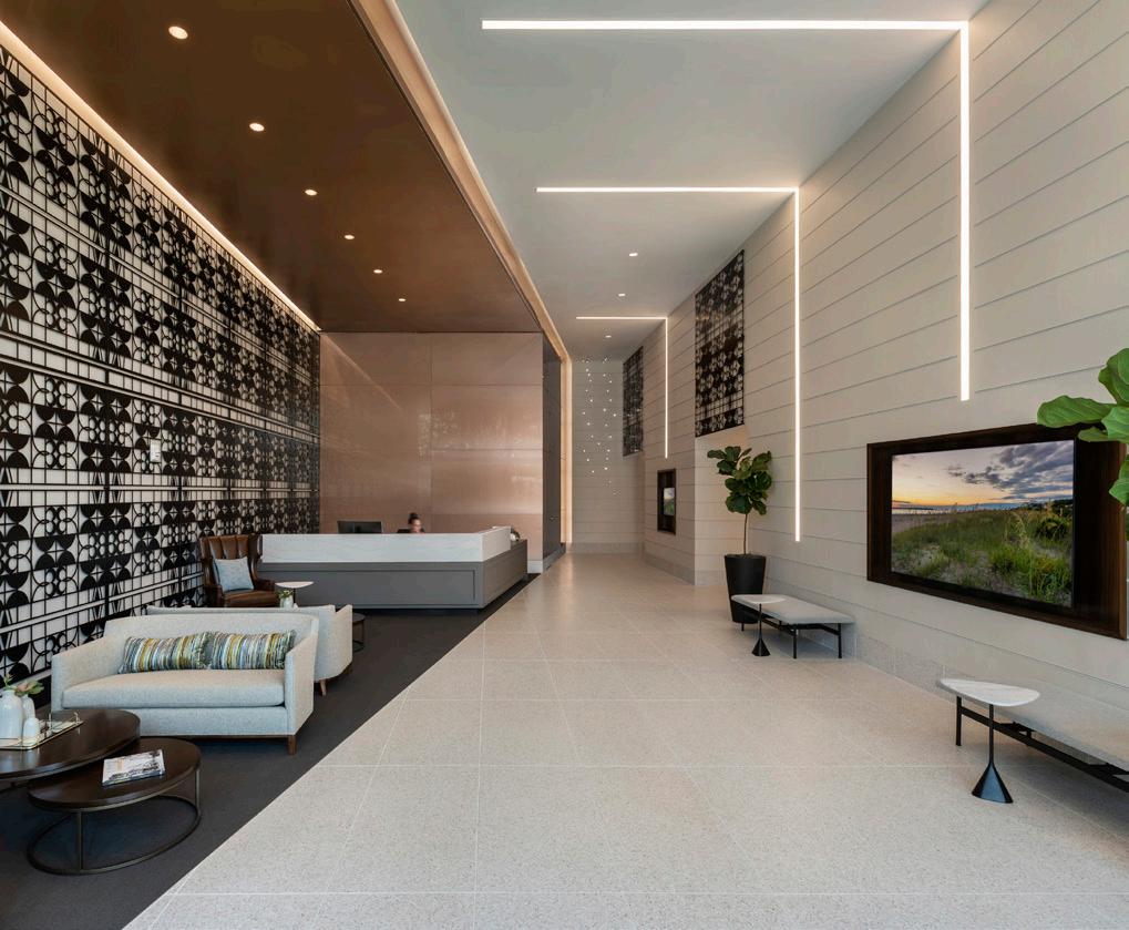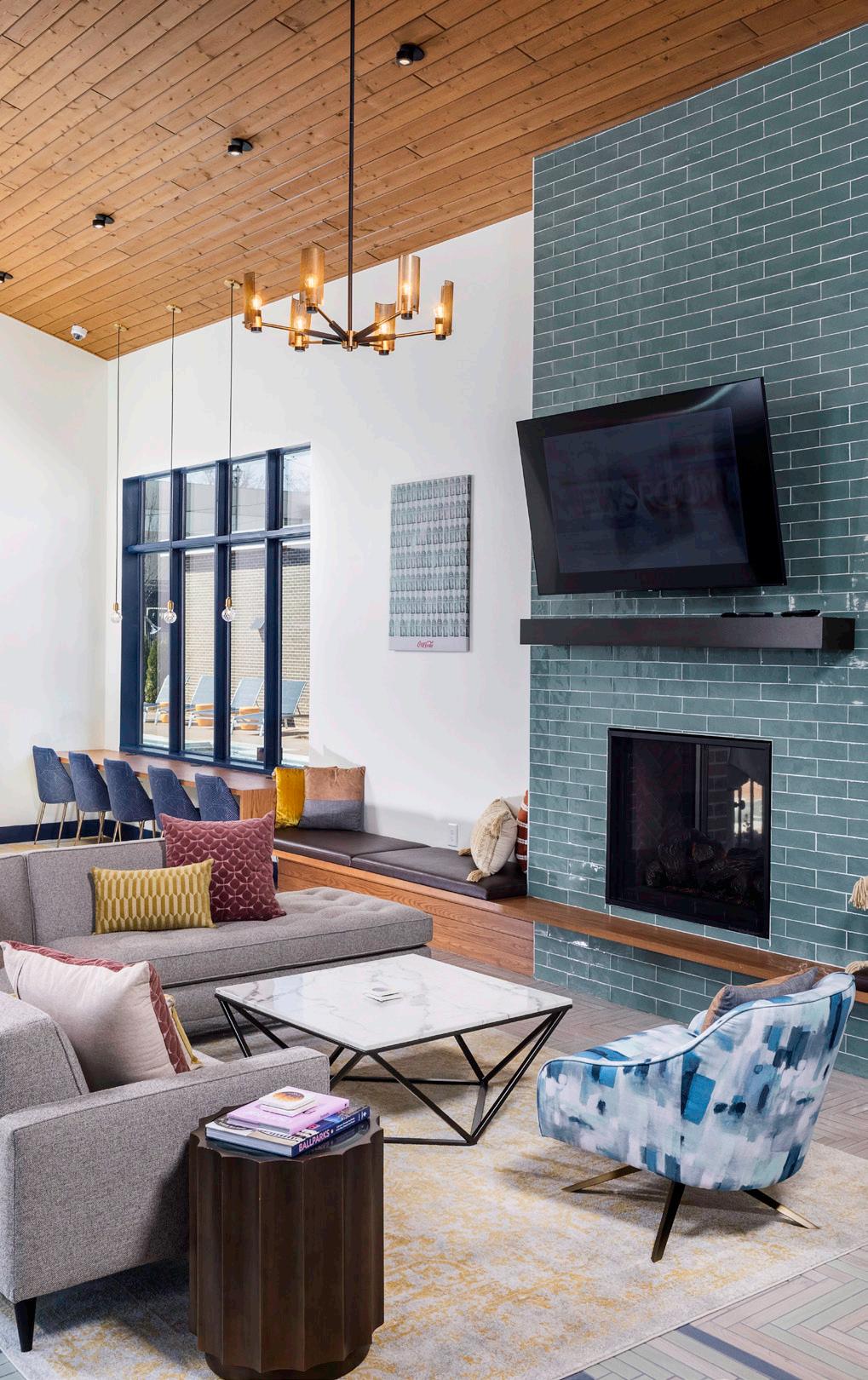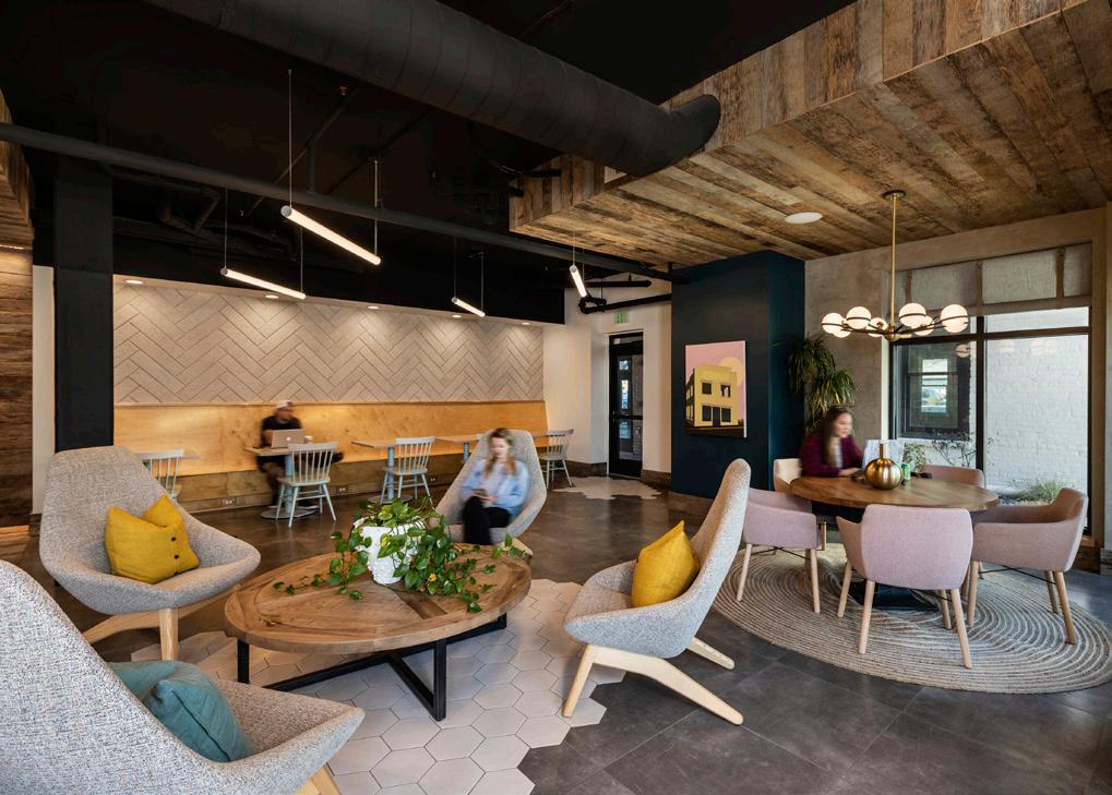 Inside, the amenity spaces feature geometric ceiling tiles and flooring transitions define areas for socializing and co-working, while vibrant accents and expansive natural light serve as beacons of creativity.