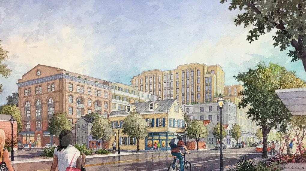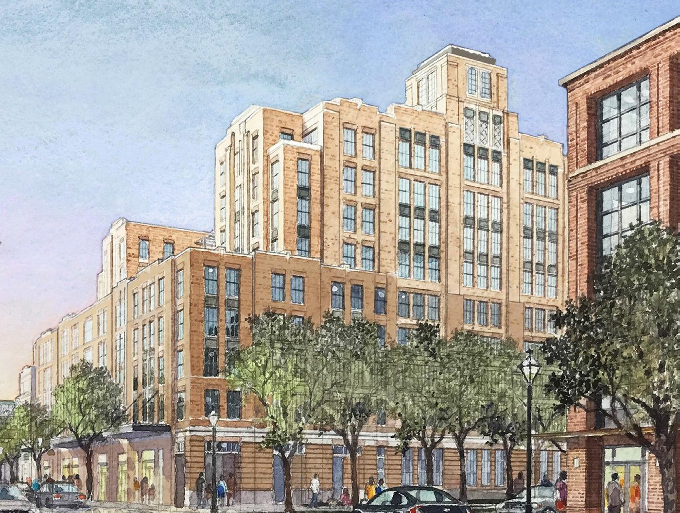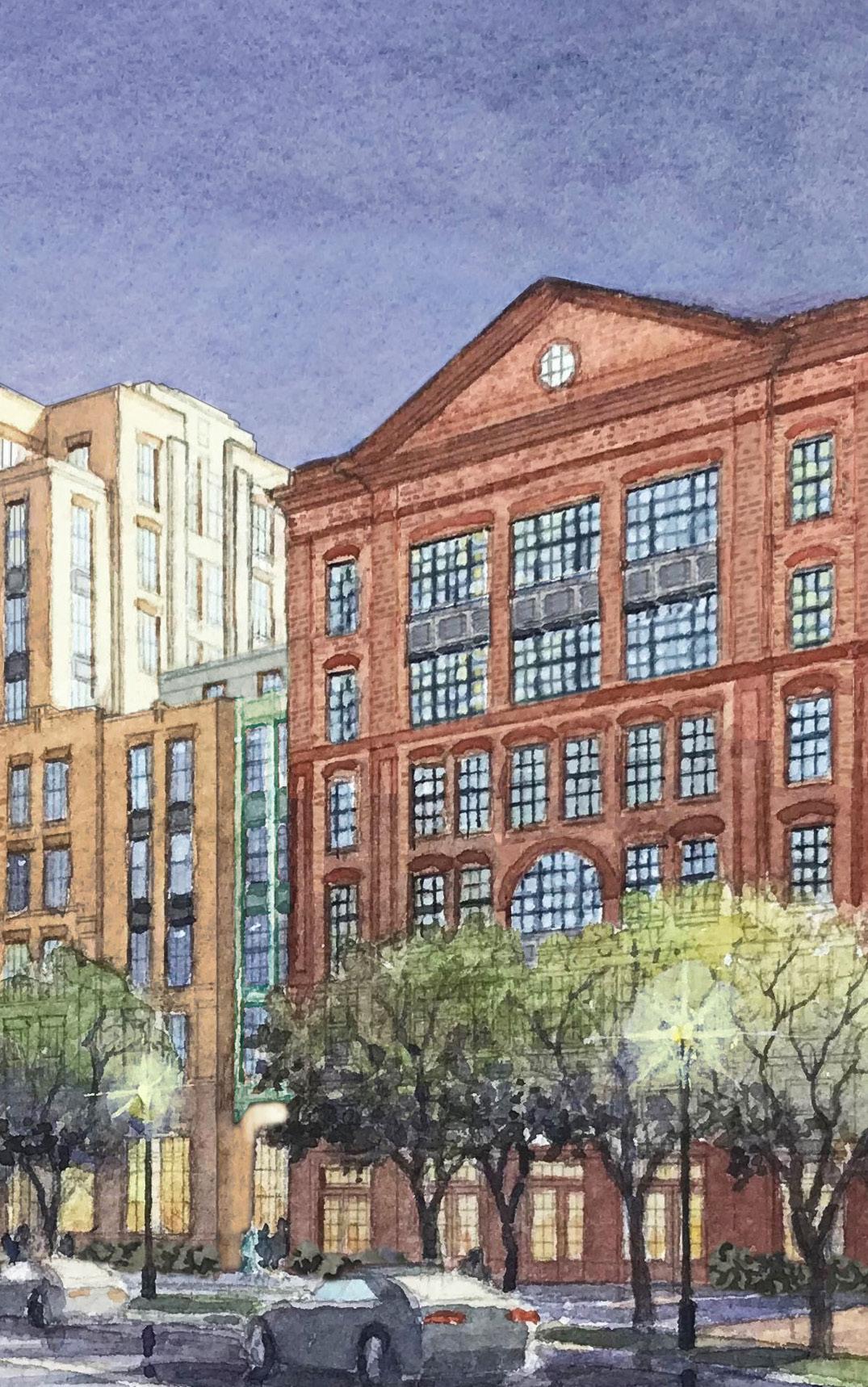 Designed by LS3P in association with RAMSA, this nine-story mixed use development features 255 residential units wrapping a six-level parking garage for 358 cars. The development also includes 8,000 SF of ground-level retail, a generous fifthfloor terrace, and the renovation of an 1849 train shed into 20 residential lofts with an additional 7,200 SF retail space.