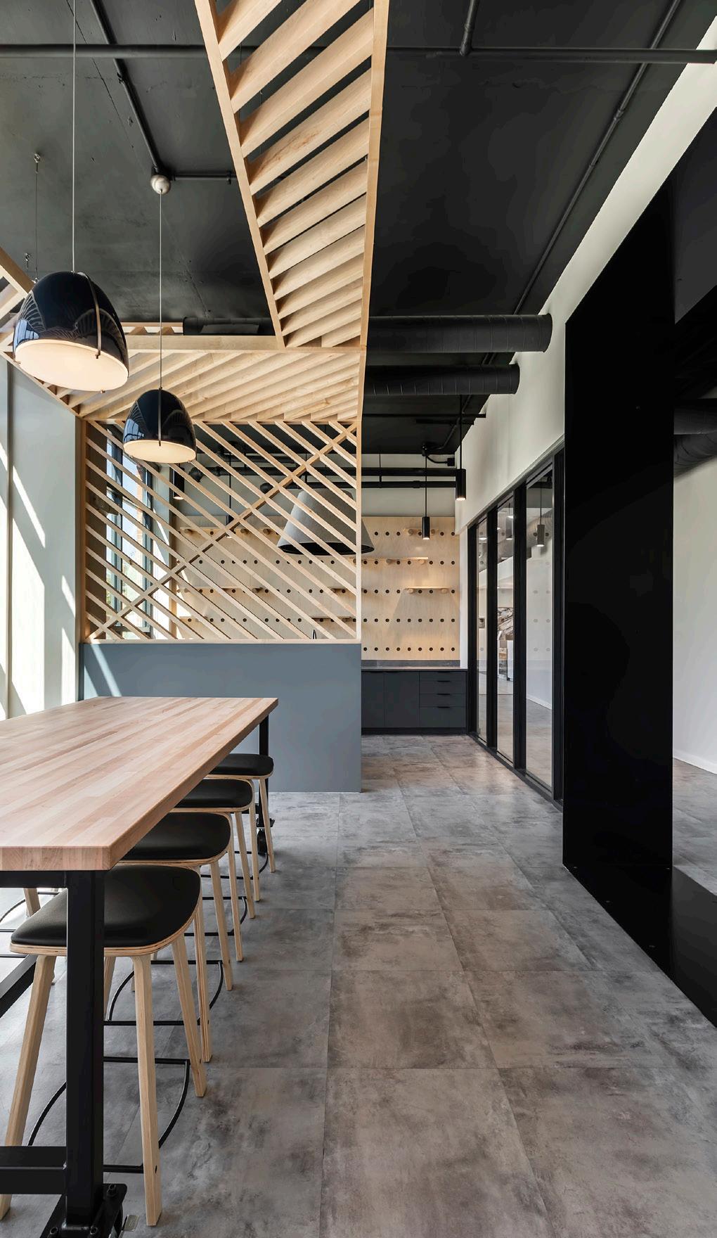 A 10’ custom steel industrial portal projects from the corridor, intentionally separating the Makerspace from the rest of the buildings and marking the transition into a creative space. Custom woodwork within balances the coolness of the industrial elements, including concrete-look LVT and the deep black steel of the portal.