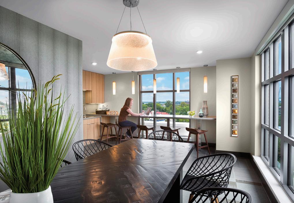 The interior design includes a unique and engaging feature: a creative Makerspace. Visible from the street, the Makerspace needed to be dynamic enough to engage with pedestrians and grab the attention of prospective residents; it also needed to be made up of easily cleanable and durable surfaces to withstand painting and other creative work.