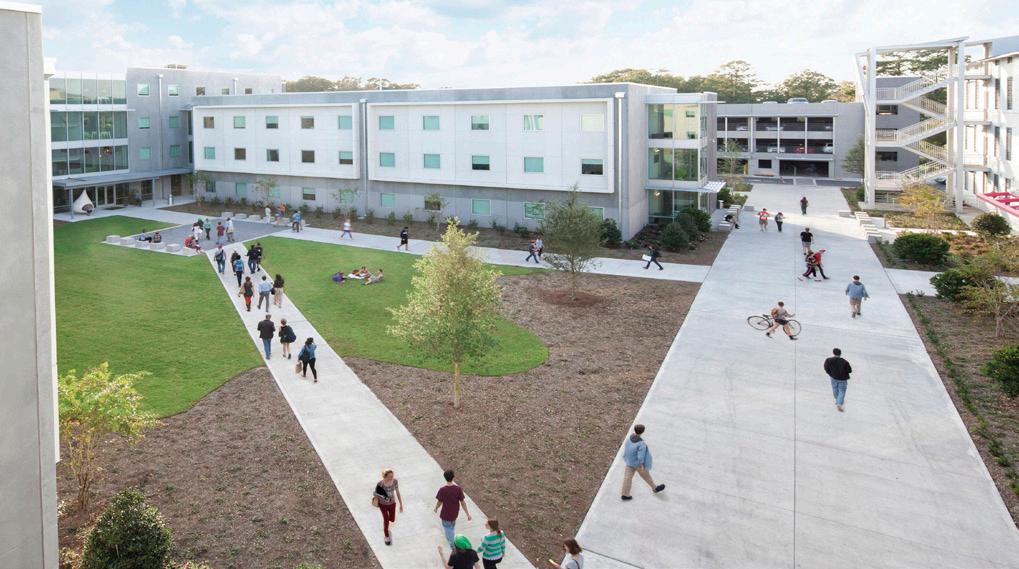 The interiors likewise reference the city’s historic architectural detailing. Features include high-end finishes with bold, studentfriendly geometric patterns. A rooftop soaking pool, fitness spaces, study lounges, and built-in niches and gathering spaces provide student space outside of the residence areas. The amenity corridor recreates the experience of meandering alleyways; porcelain tile slabs lining the corridor resemble the color of wrought iron and the texture of plaster. Handmade wall tile installations create a sense of movement and mimic the growth of a native creeping fig, while a vaulted concrete and structural glass paver system provides filtered light from above, reminiscent of dappled light shining through a tree canopy on a leisurely garden walk.