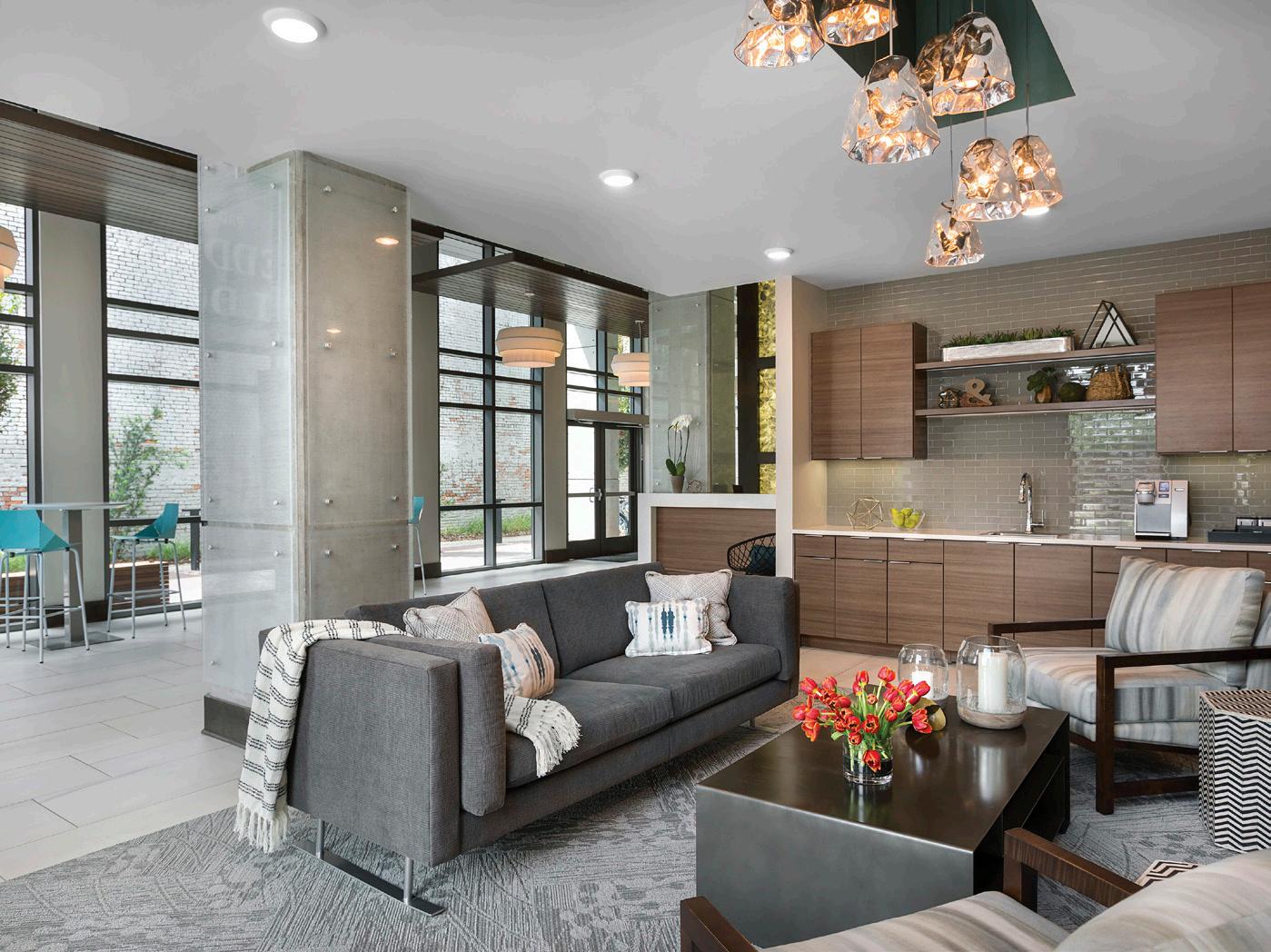 The Victory at Summerhill includes 276 units ranging from studio to two-bedroom. A detached clubhouse features co-working pods, vintage arcade games, and library-style tables for collaboration.
