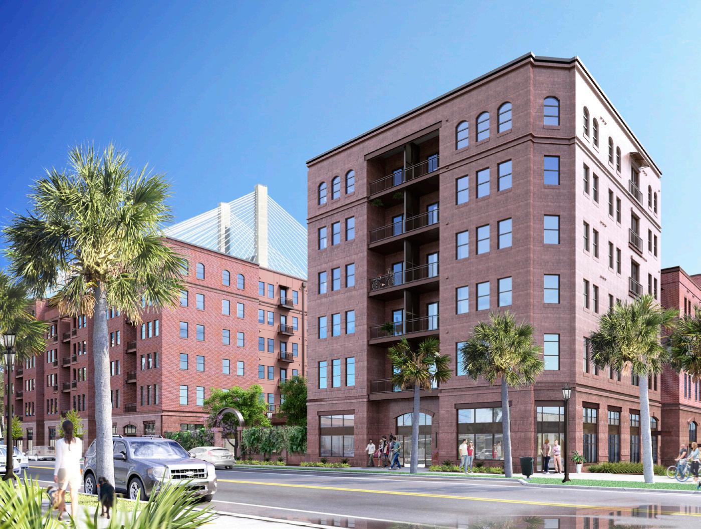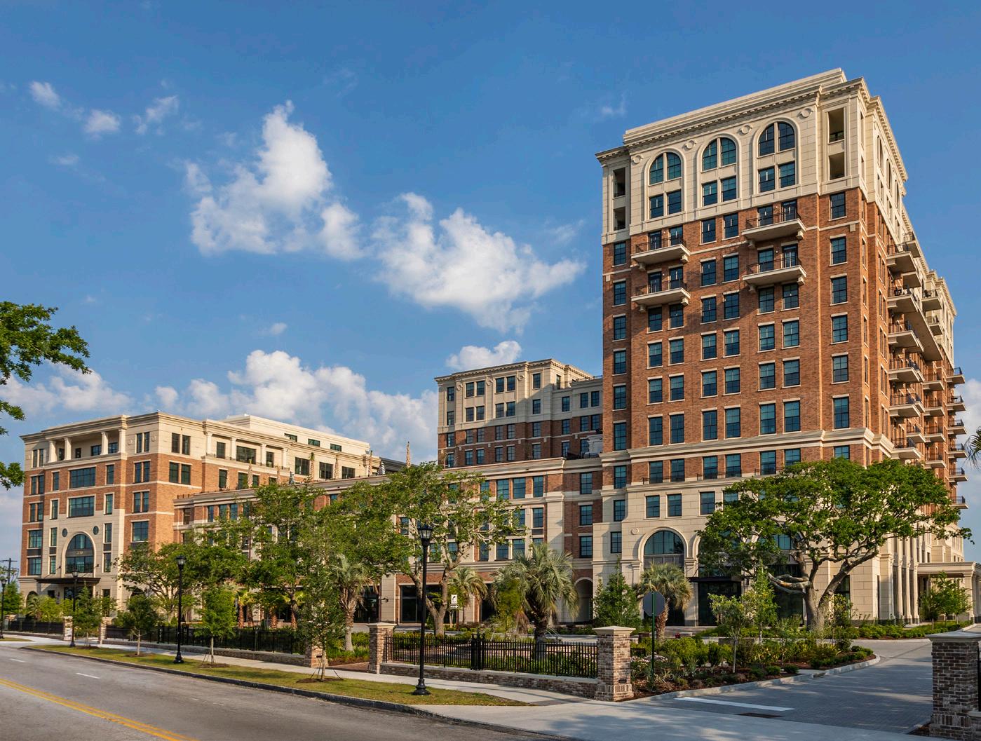 This four-story multi-family residential project takes its cue from the surrounding traditional Lowcountry architecture with a materials palette of brick stucco with stone accents.