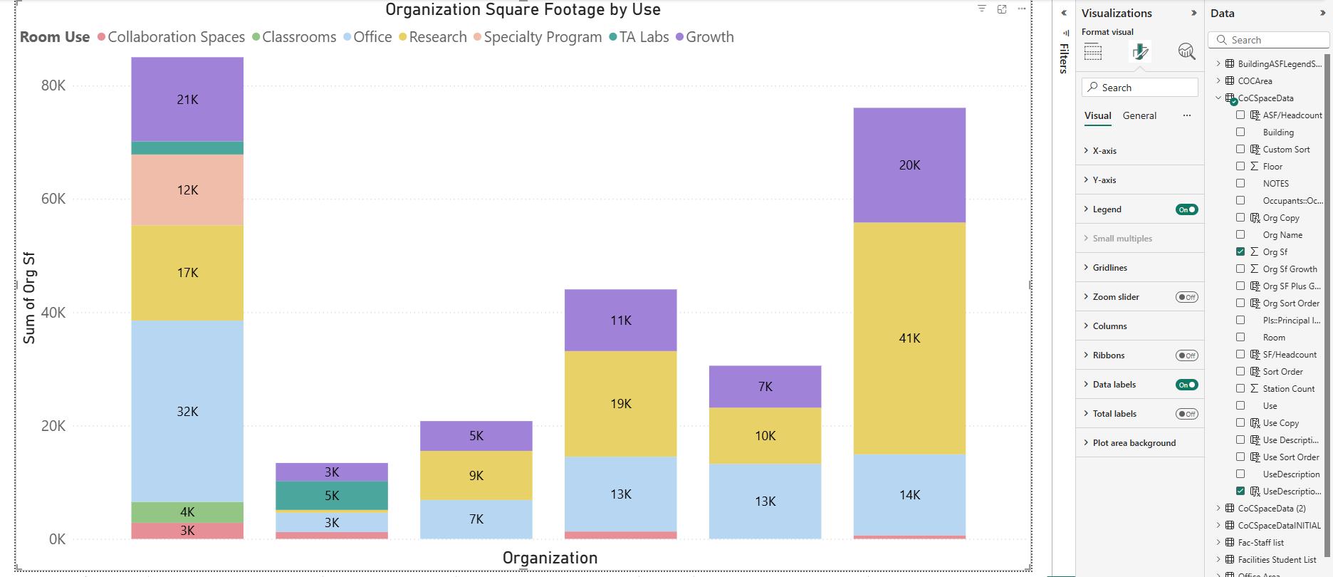 After the data is confirmed by all team members, the team needs to translate the data from spreadsheets into Power BI visuals for analysis. Human intuition is invaluable at this stage; it takes skill and judgment to categorize the data appropriately. For example, grouping room use codes requires finesse. At this stage, the team can start to build visuals illustrating use types, break out functions within each building, and test several iterations of graphics to see what communicates most clearly (another function for which human intuition is critical).