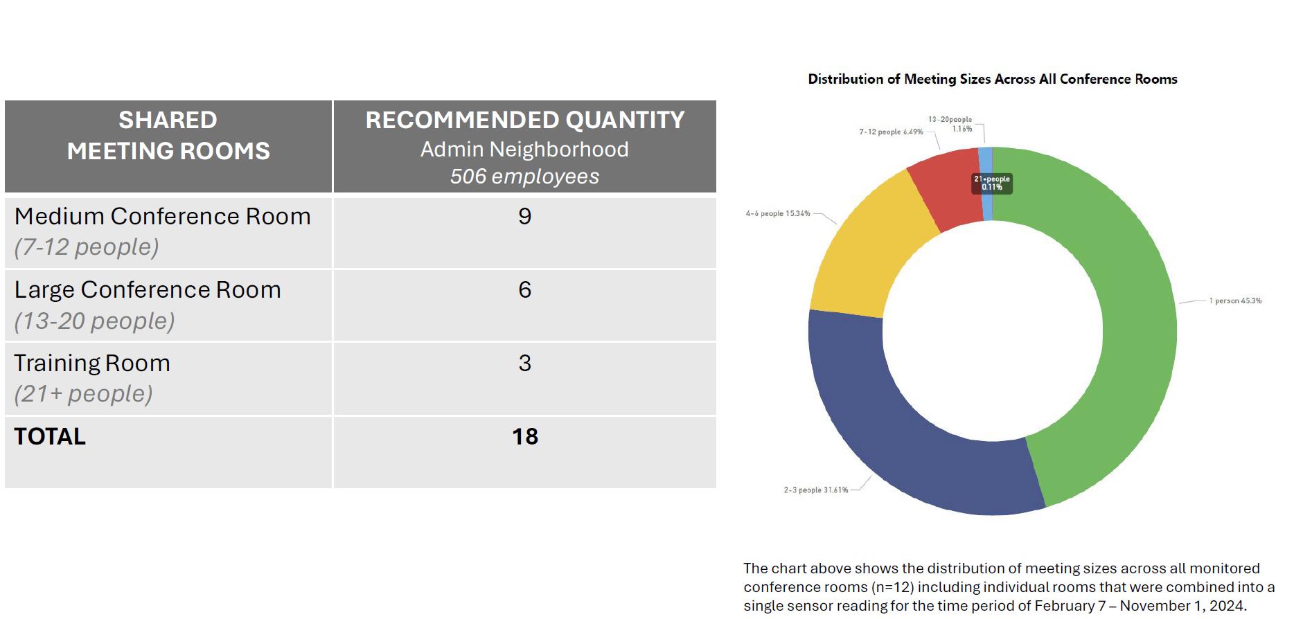 An in-depth study of conference spaces revealed that while these rooms were heavily utilized, they were often sized incorrectly. Most uses involved small groups of 1-6 people, yet the rooms were designed for larger gatherings. The strategy moving forward included right-sizing conference spaces, working towards ease of scheduling, consistency of technology, and building awareness of meeting space options.