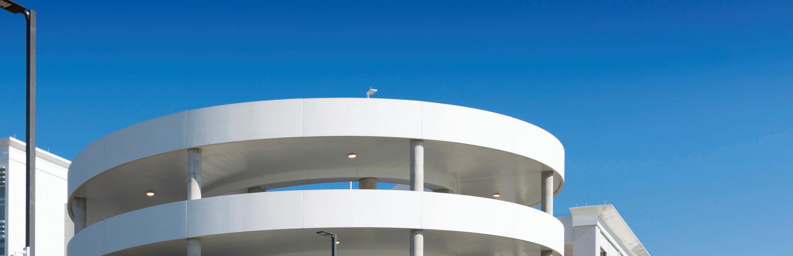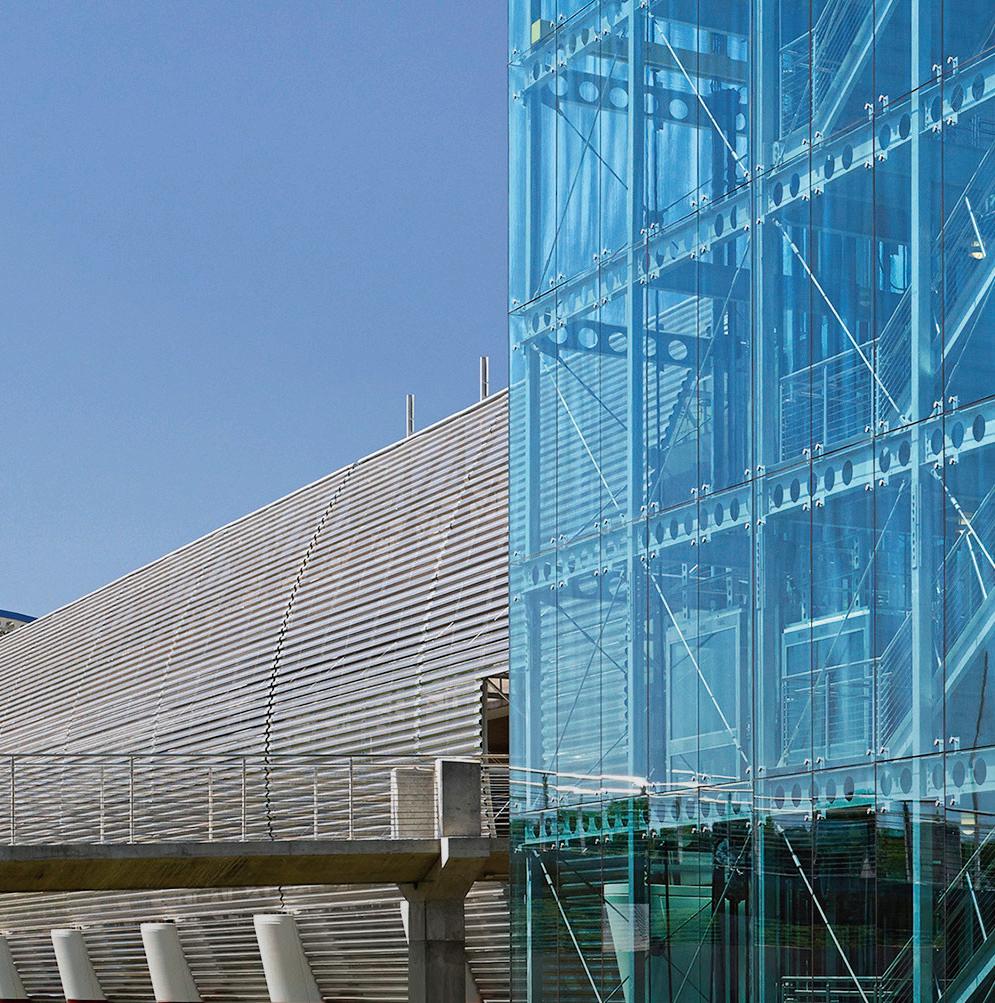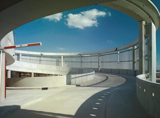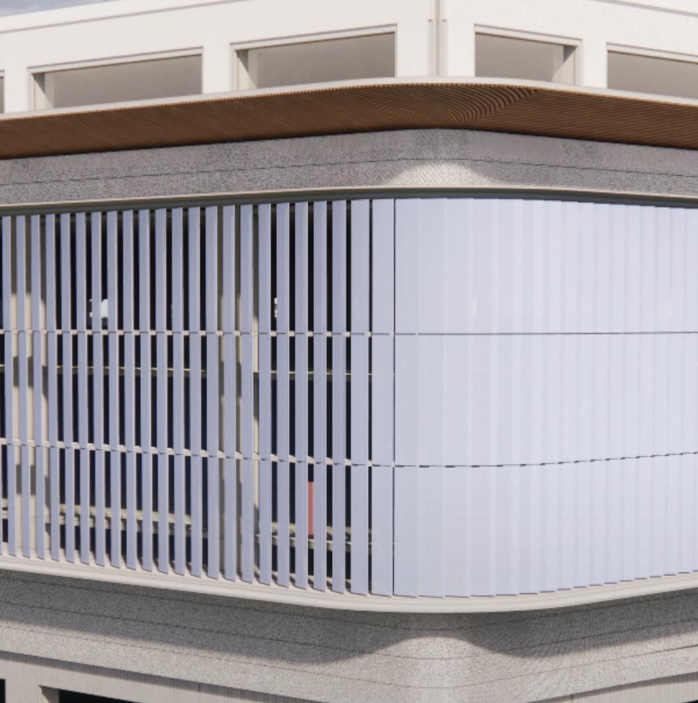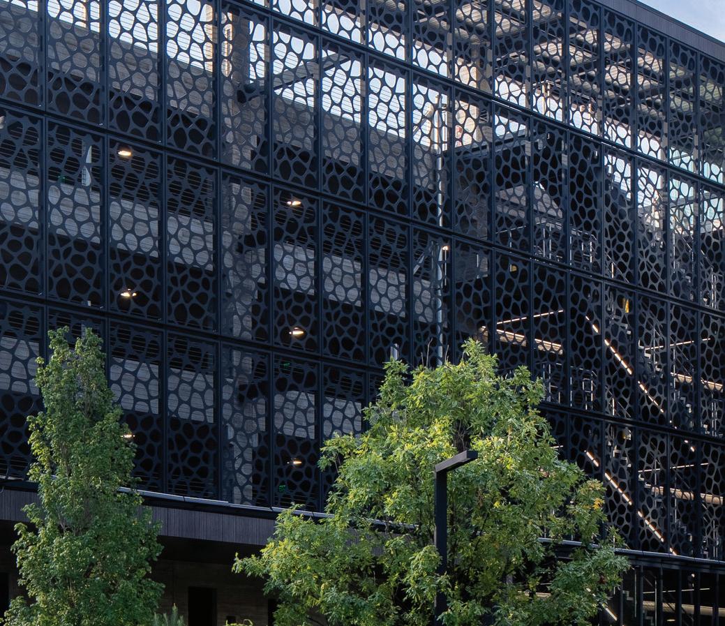 Architectural features such as glassbacked elevators and glazed stair towers provide both functional vertical circulation and visual interest, helping to scale the structure appropriately alongside the adjacent arena. A standout element is the express helix ramp — a bi-directional system that allows drivers to ascend or descend two levels with a single rotation. This ramp also cleverly conceals a rainwater cistern used for onsite irrigation, demonstrating a commitment to sustainability.