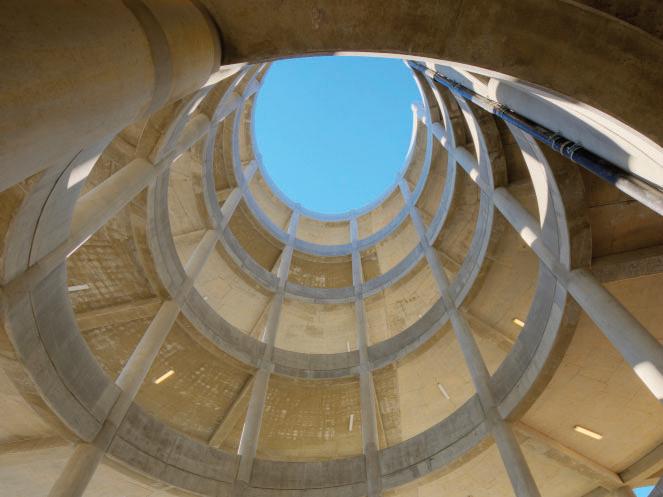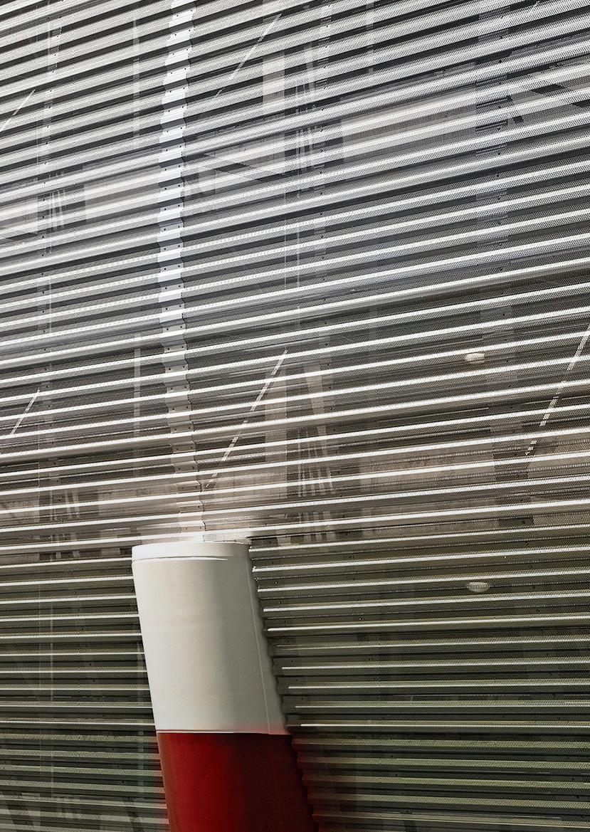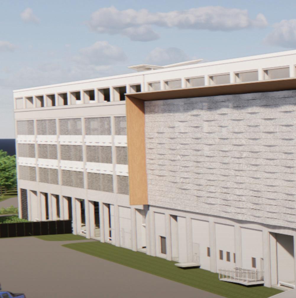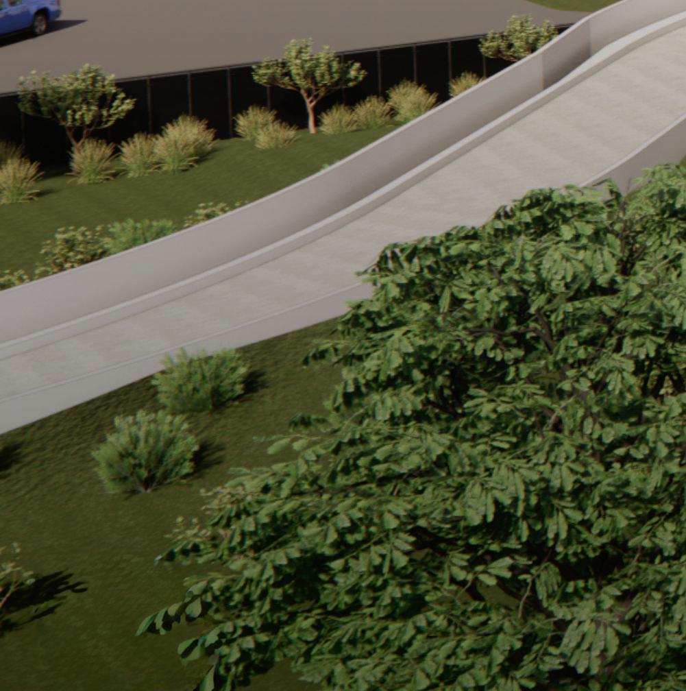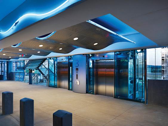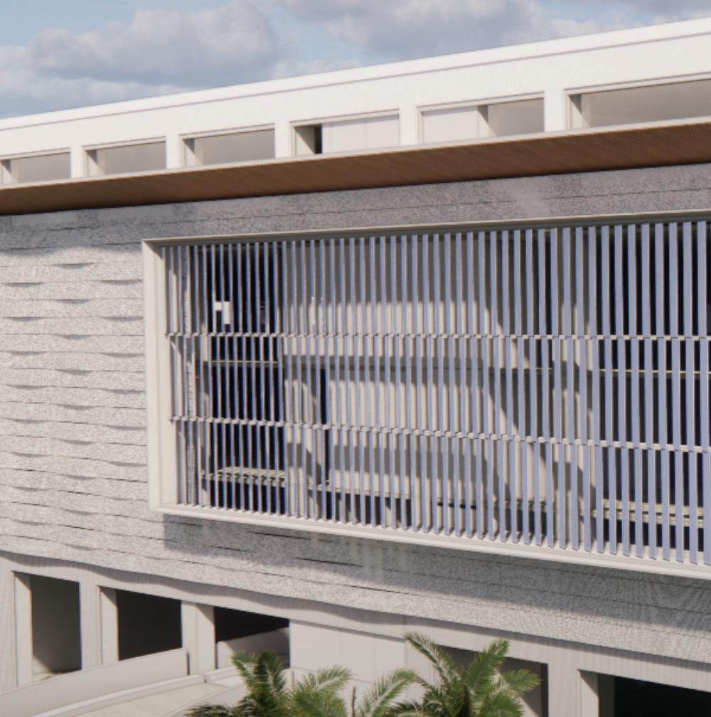 Architectural features such as glassbacked elevators and glazed stair towers provide both functional vertical circulation and visual interest, helping to scale the structure appropriately alongside the adjacent arena. A standout element is the express helix ramp — a bi-directional system that allows drivers to ascend or descend two levels with a single rotation. This ramp also cleverly conceals a rainwater cistern used for onsite irrigation, demonstrating a commitment to sustainability.