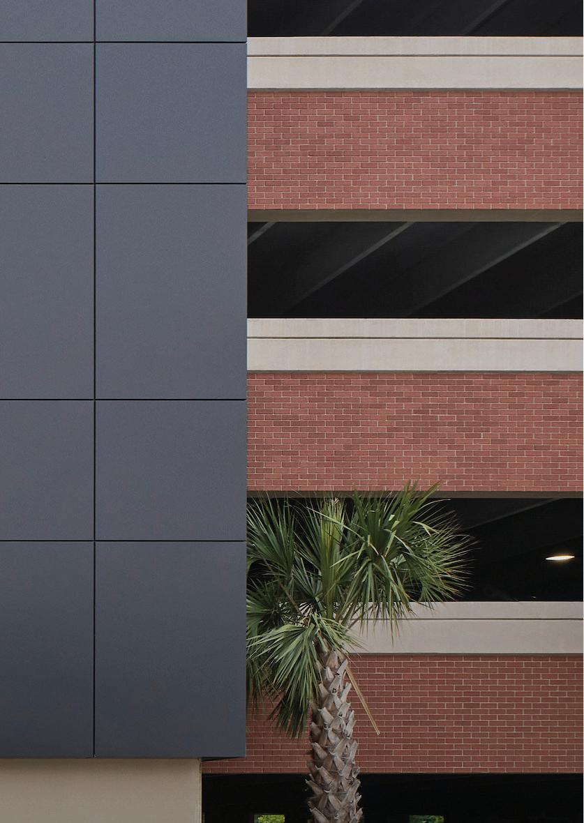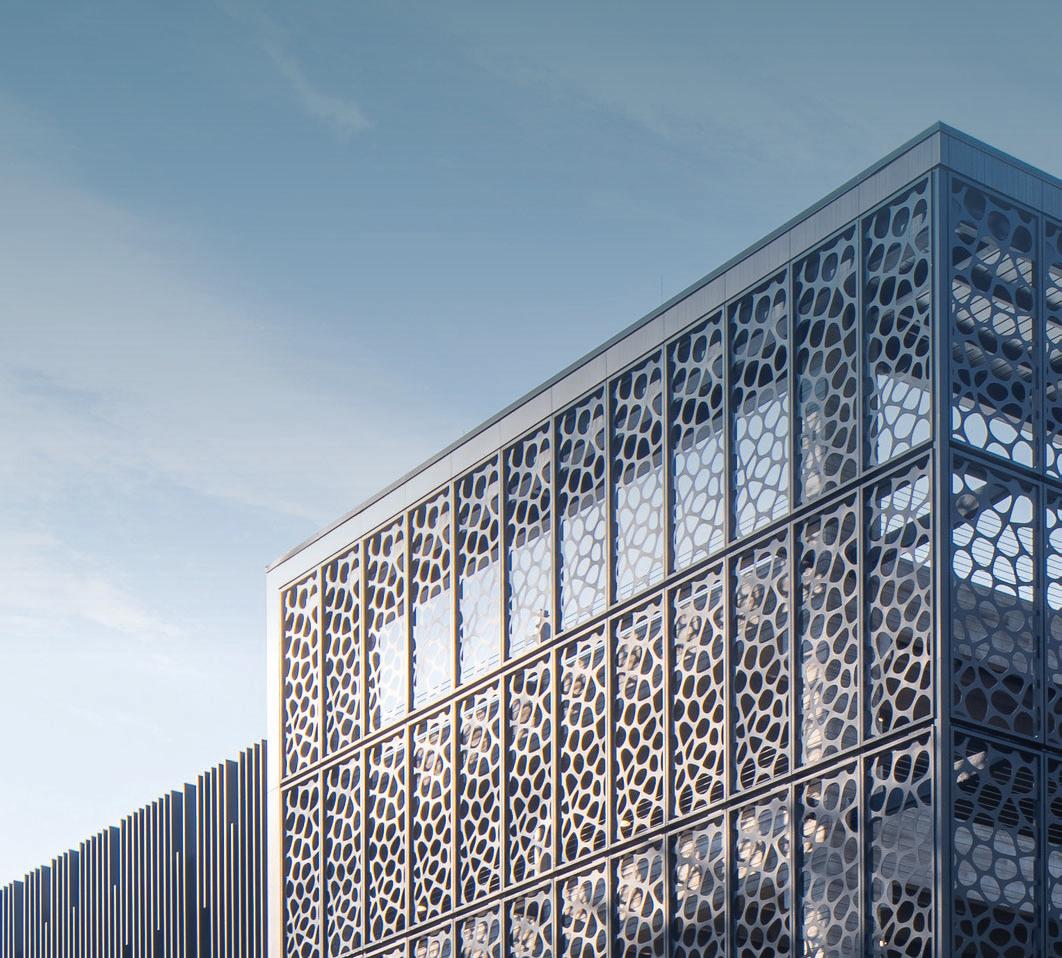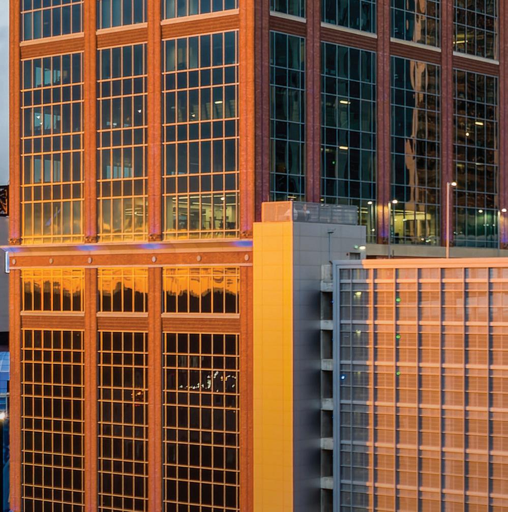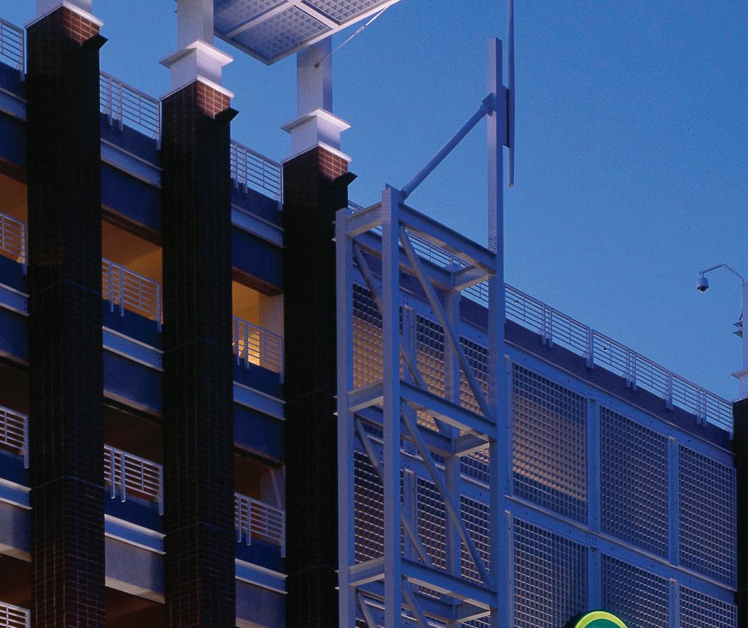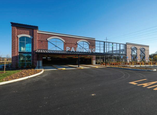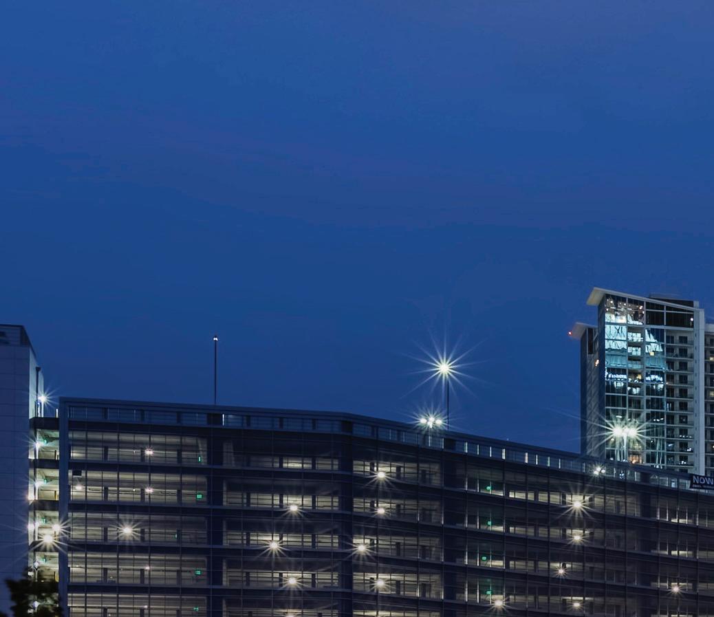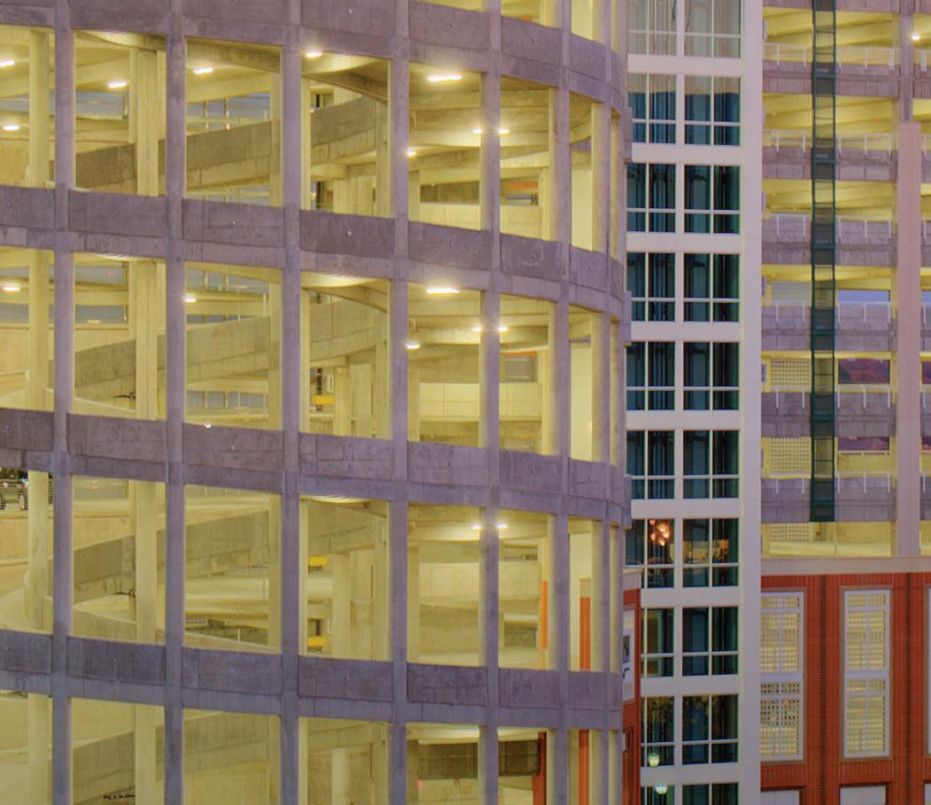 Center City Green is a 12-level, LEEDcertified parking garage offering 1,400 spaces in a compact, high-density urban setting. Located on a uniquely shaped two-acre site bordered by public streets, a light rail line, and major cultural landmarks, the garage is designed to integrate seamlessly into its surroundings. Ground-level retail activates the street edge, enhancing the pedestrian experience and supporting local commerce.