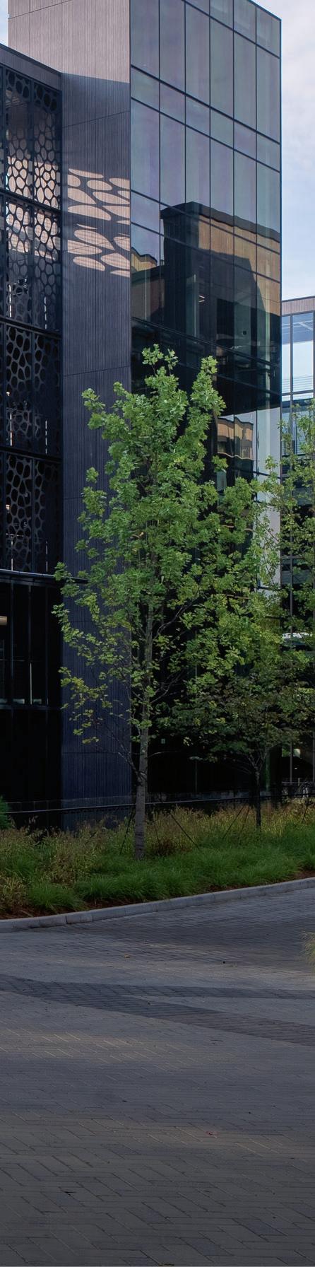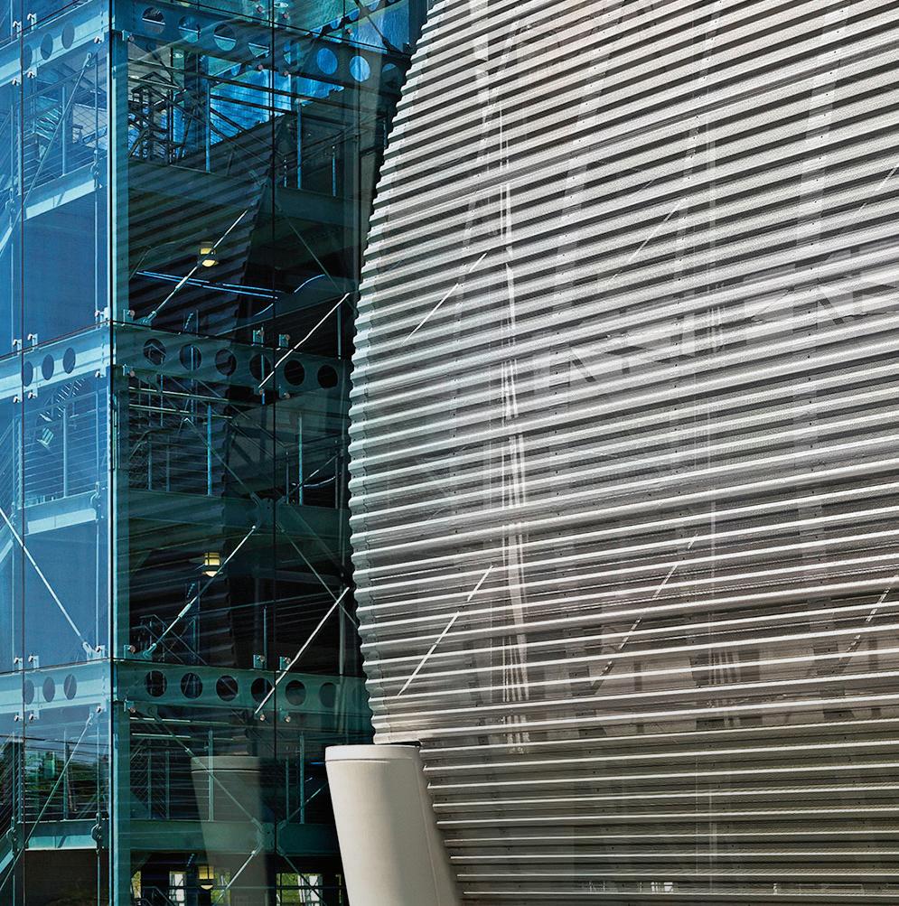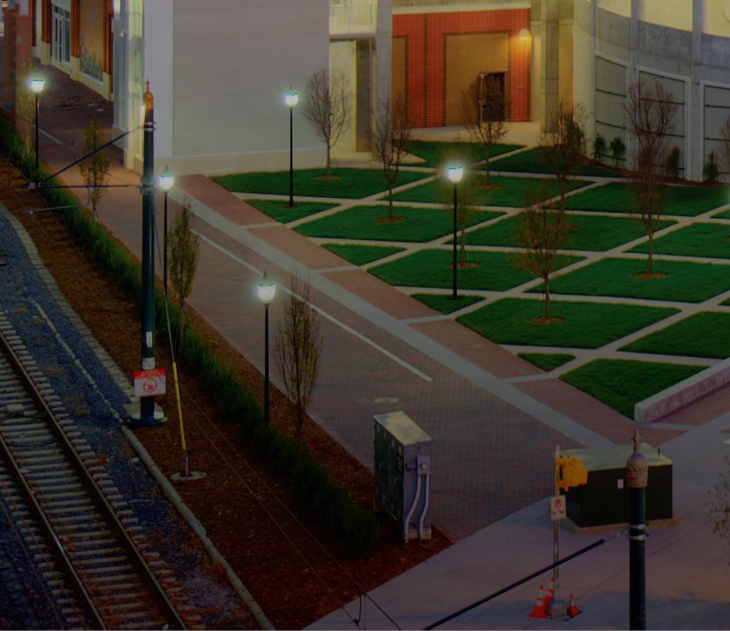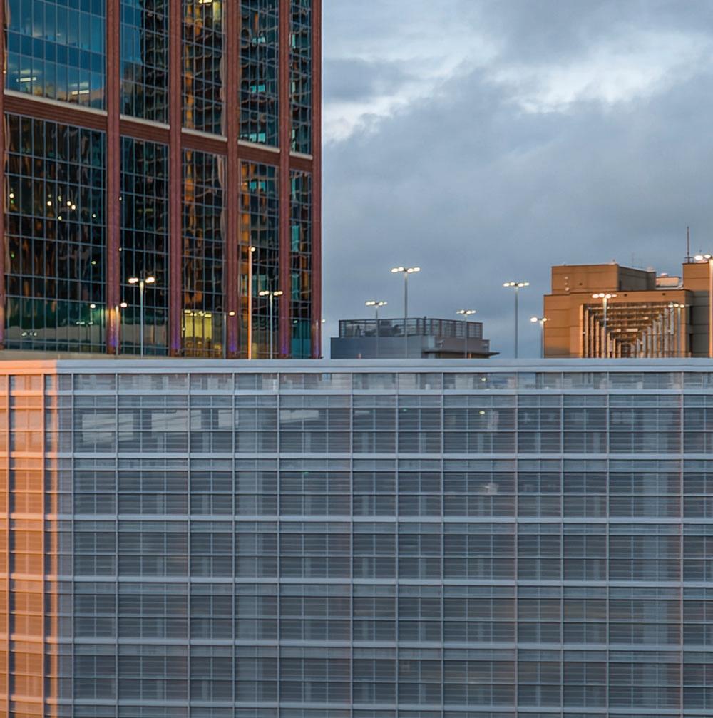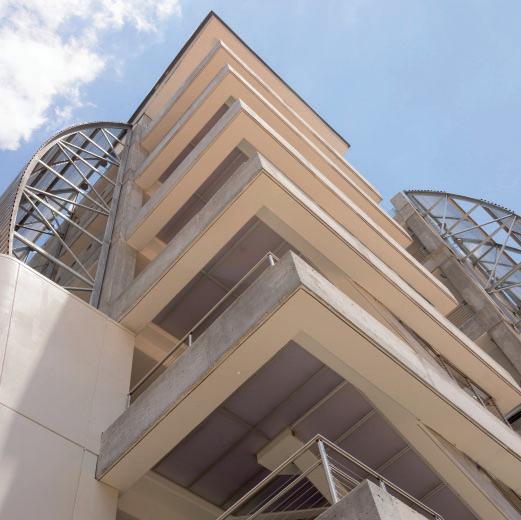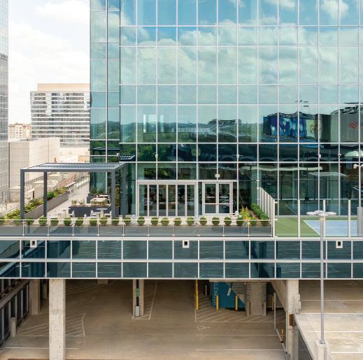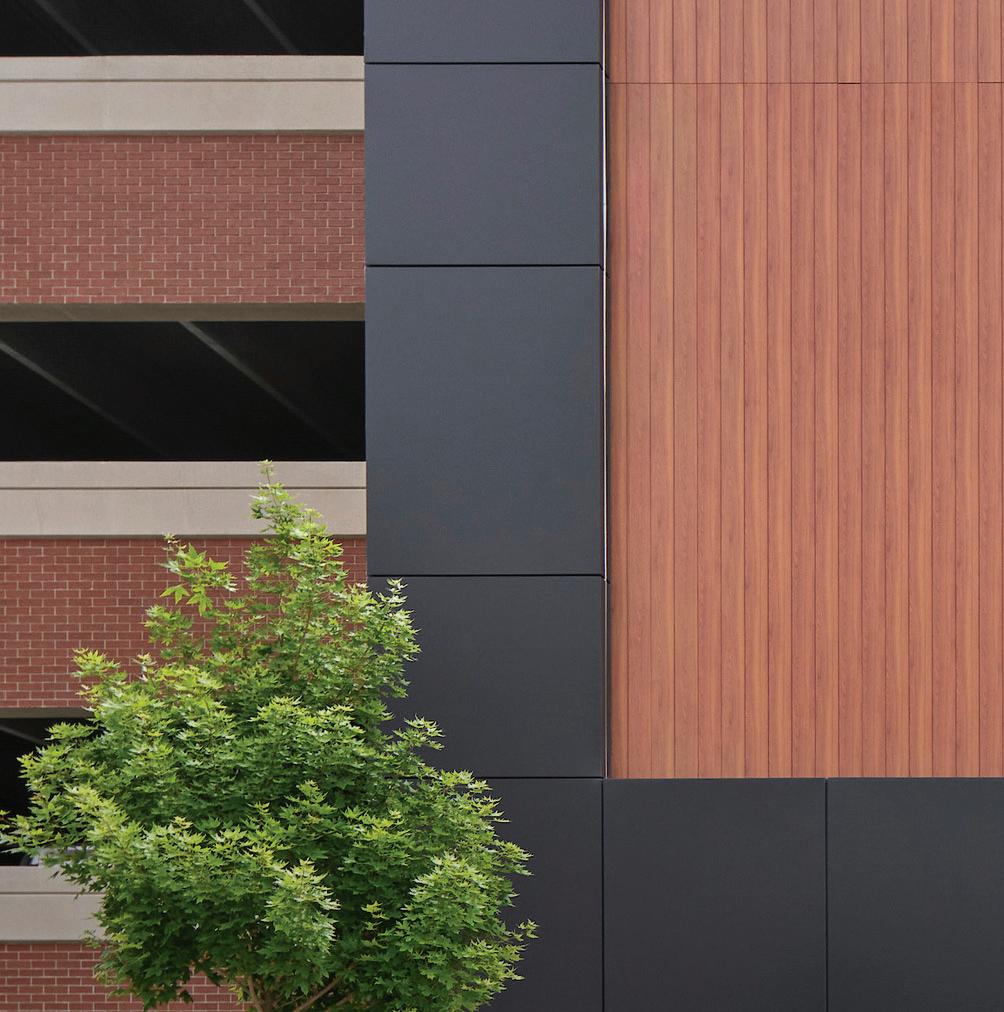 Center City Green is a 12-level, LEEDcertified parking garage offering 1,400 spaces in a compact, high-density urban setting. Located on a uniquely shaped two-acre site bordered by public streets, a light rail line, and major cultural landmarks, the garage is designed to integrate seamlessly into its surroundings. Ground-level retail activates the street edge, enhancing the pedestrian experience and supporting local commerce.