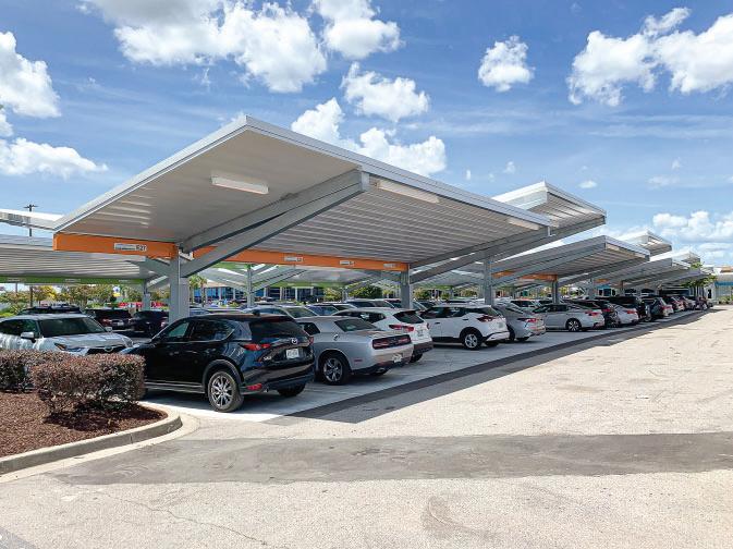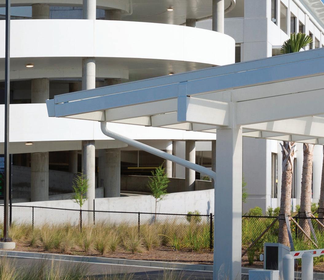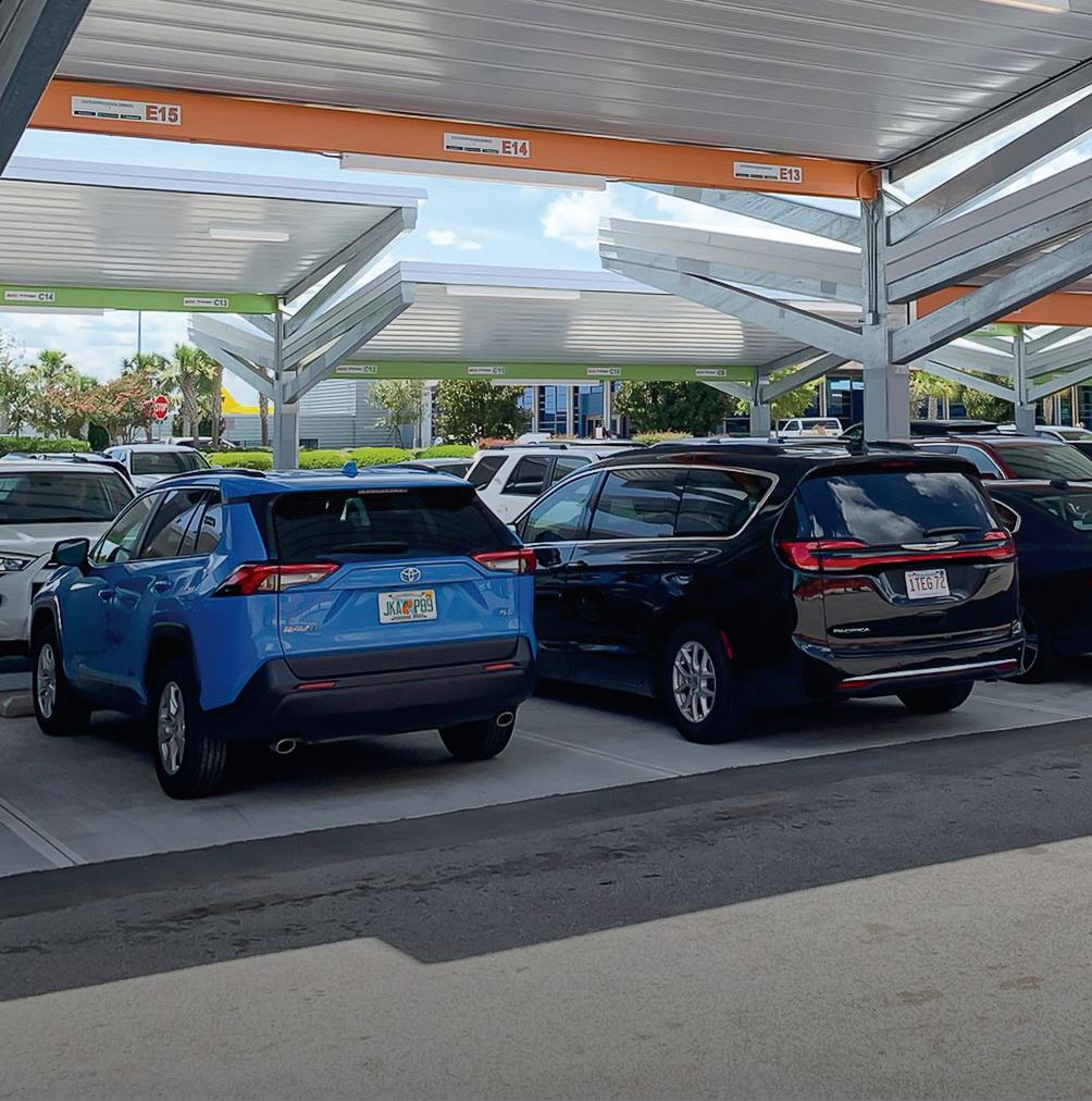 Subtle use of airport-branded colors on each canopy row aids intuitive wayfinding for passengers locating their vehicles. All exposed structural elements are hot-dip galvanized, ensuring a durable, maintenance-free finish.