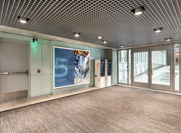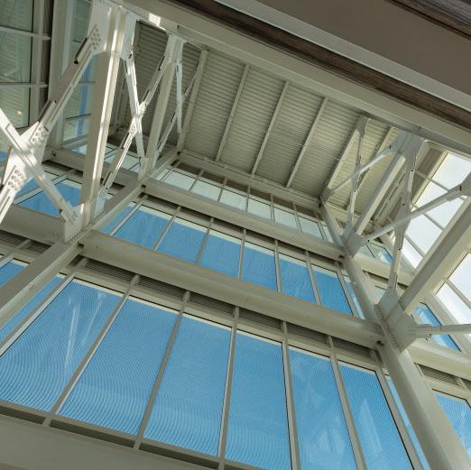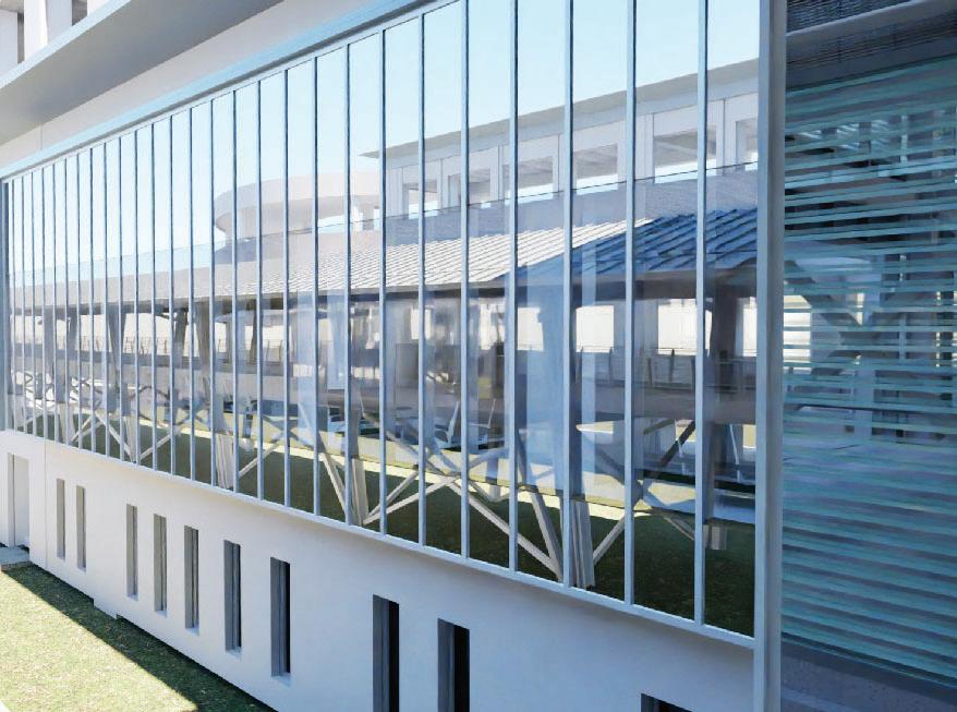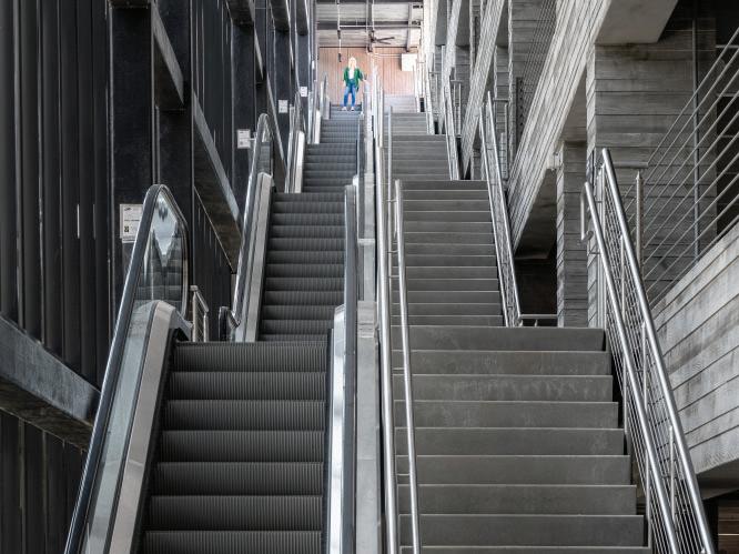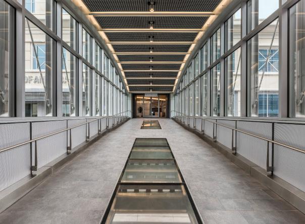 Steel-framed stair and escalator cores, filled with natural light, promote pedestrian flow between levels. These vertical circulation zones are clad in curtainwall or perforated metal panels, balancing protection with aesthetic continuity. Solar panels on the roof power elevators and escalators, supporting the campus’s WELL Certification.