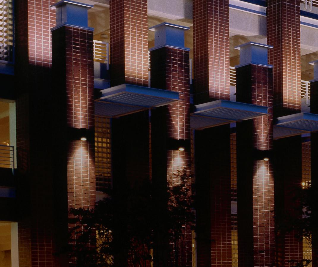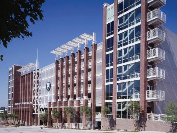The architectural design reinforces the red-brick character of the historic center of Greenville, providing a street-level arcade and giving vertical emphasis to an otherwise horizontal building. The facade successfully masks the sloping plates of the parking ramps. The brise-soleils add textured shadowing to the exterior, while the glazed stairway enclosures act as nighttime lanterns and draw visual emphasis to pedestrian access points. The vehicle entrance is expressed as a portal with a deck layout that accommodates access from multiple streets with revenue control systems for both card access and pay-per-visit customers.