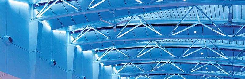 These garages go beyond conventional parking design. Perforated stainless steel panels, backlit in blue to reflect the airport’s brand, provide visibility while revealing the underlying truss structure. These panels also support natural ventilation, eliminating the need for mechanical fans and ductwork.