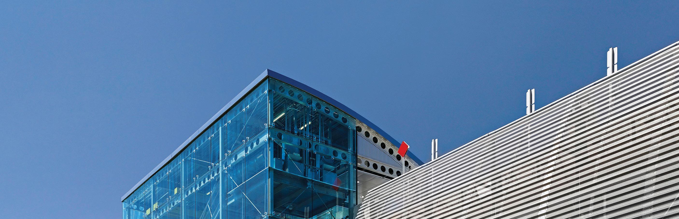 The façade evolves throughout the day — by daylight, the metal panels evoke the profile of an airplane wing, symbolizing innovation and technology. At night, accent lighting creates a more theatrical effect. The underside of each level is painted white to enhance safety, reduce the need for artificial lighting, and lower energy costs.
