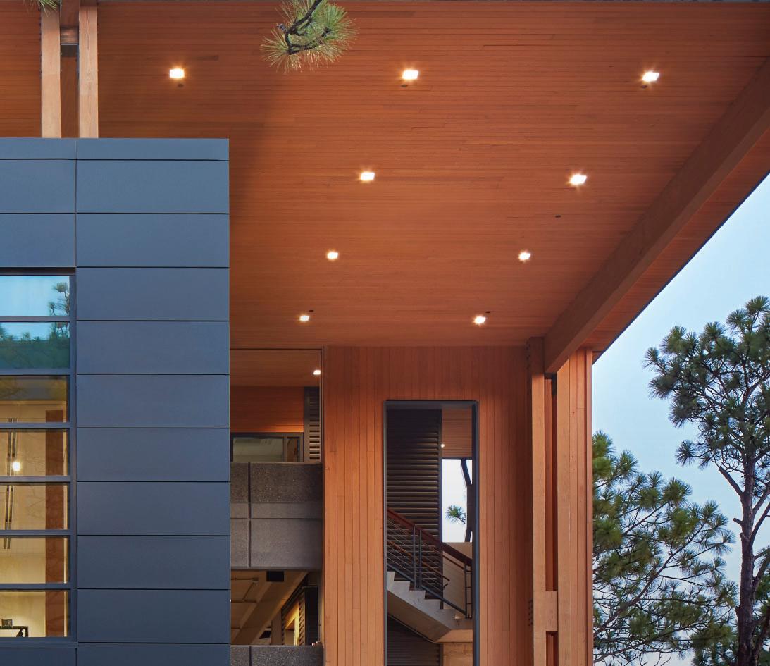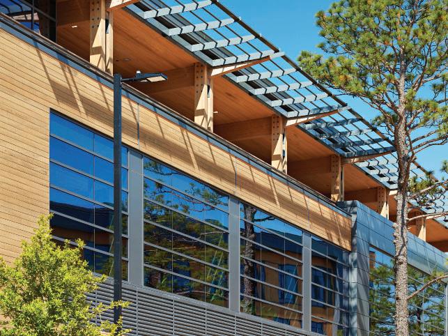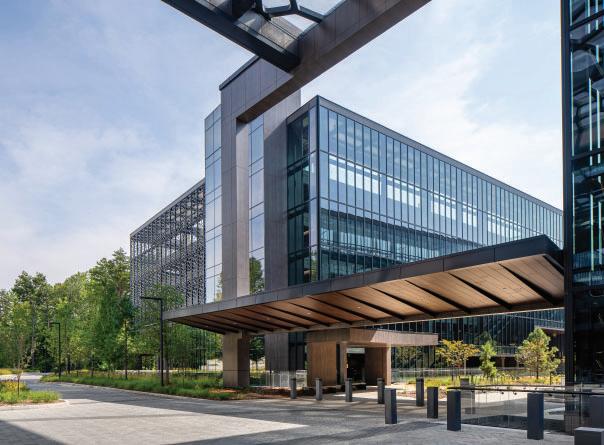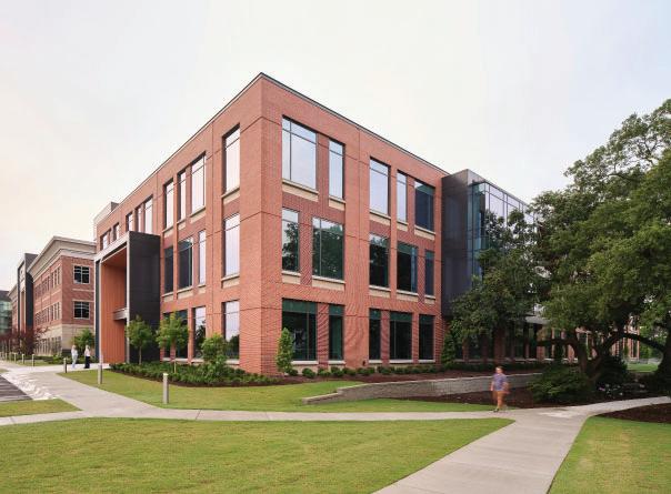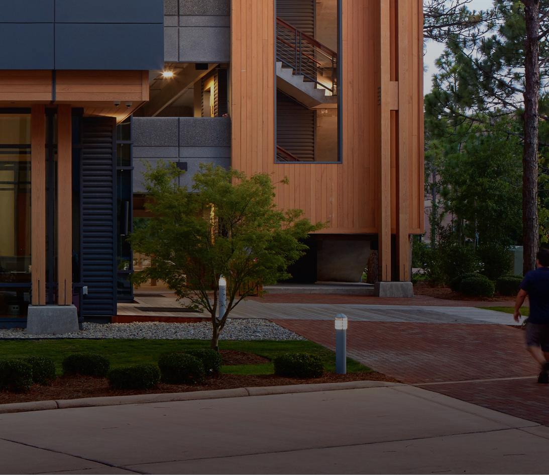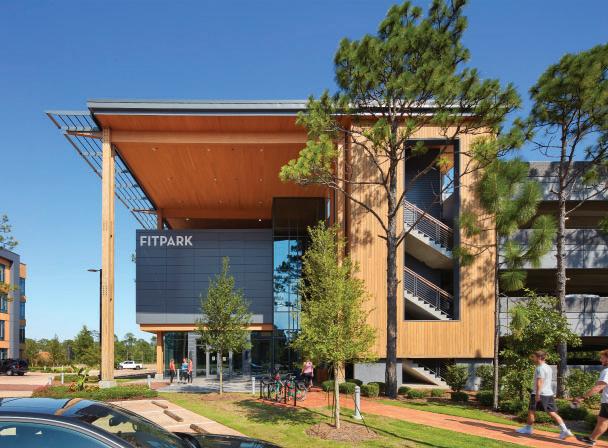 The fitness component forms a dynamic façade, buffering adjacent buildings while promoting movement and wellness. Inspired by the verticality of longleaf pines, the structure’s form and materials reflect the natural site.