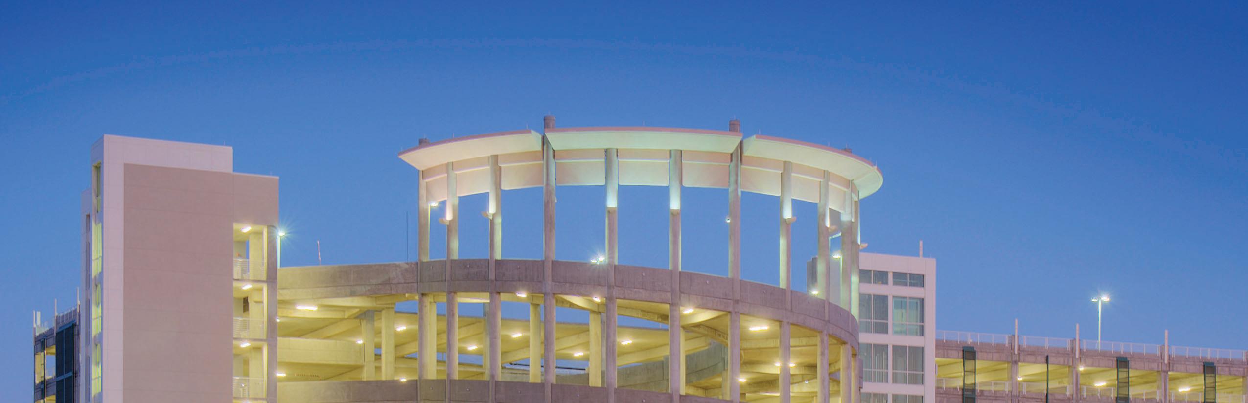Phase 1 features a four-story parking garage constructed with posttensioned cast-in-place concrete. Completed in 2011, it provides 3,200 parking spaces accessed via separate cast-in-place helices designed to optimize circulation and wayfinding. Open stairwells and glass-enclosed elevator cores further enhance accessibility and navigation.