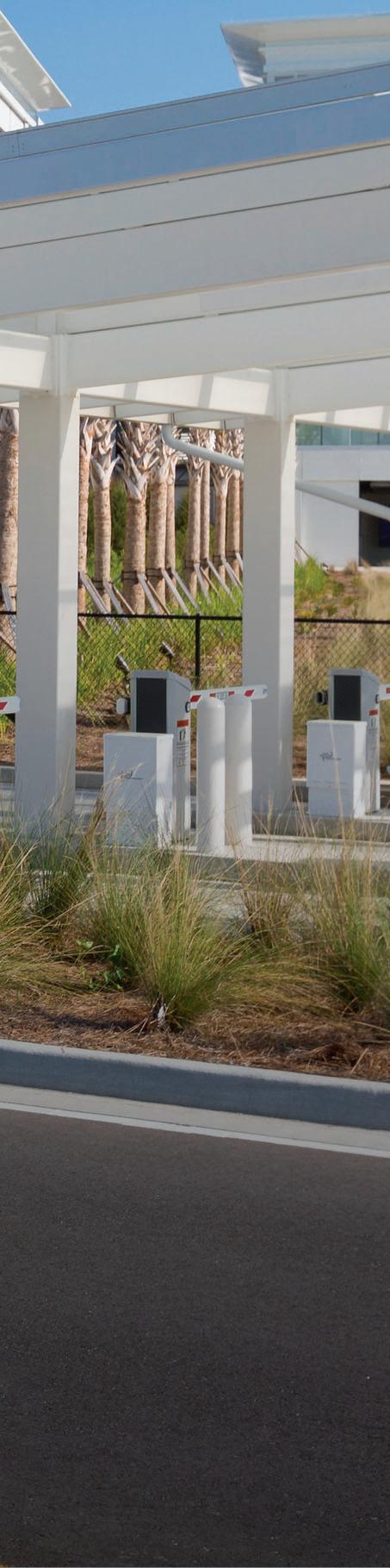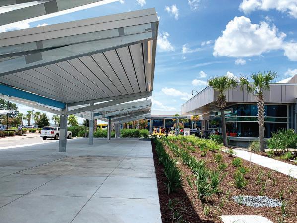 The new surface lot Rental Car (RAC) Canopies at Myrtle Beach International Airport provide weather protection for 650 vehicles while visually breaking up the expanse of the large site. The design thoughtfully considers perspectives from both above and below, utilizing a stepped module to interrupt the long spans.