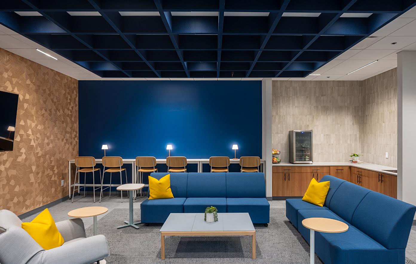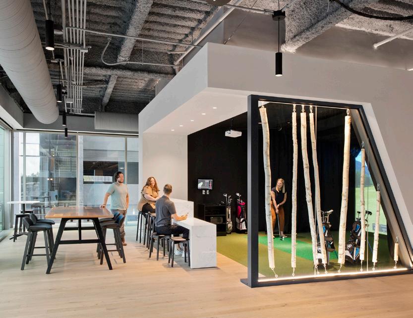The client’s “people first” ethos led to a workplace design focused on wellness, spontaneous collaboration, and activity-based work areas. Amenity spaces on every floor range from golf and NASCAR simulators to giant chess games, a music room, and a library. A barista area with grab-and-go food options doubles as a popular gathering and meeting space. Natural light, expansive views, flexible seating, enticing stairways, a living wall, and sustainable product choices all contribute to a welcoming workplace.