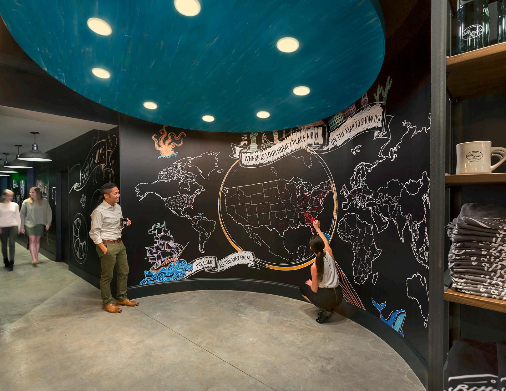 The company’s stores offer inviting, relaxed community spaces where everyone is welcome. The experiential graphic design (EGD) explains the company’s mission and underscore the company’s mantra that “It’s More Than a Cup of Coffee.”