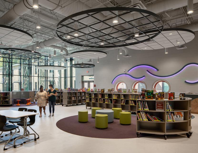 This replacement school celebrating the legacy of a Civil War hero serves Pre-K through 8th grade students in colorful, light-filled spaces designed for discovery and imagination. Students and staff are connected to nature through large windows (including enticing porthole-inspired viewpoints) and ample outdoor amenities; other natural elements find their way into the building through elements such as terrazzo flooring that uses local shells and recycled glass to depict a coastal map, seaweed inspired sun shades, and curved accents. A brightly colored monumental stair encourages activity, and a custom hand-drawn mural encourages school pride and a sense of place.