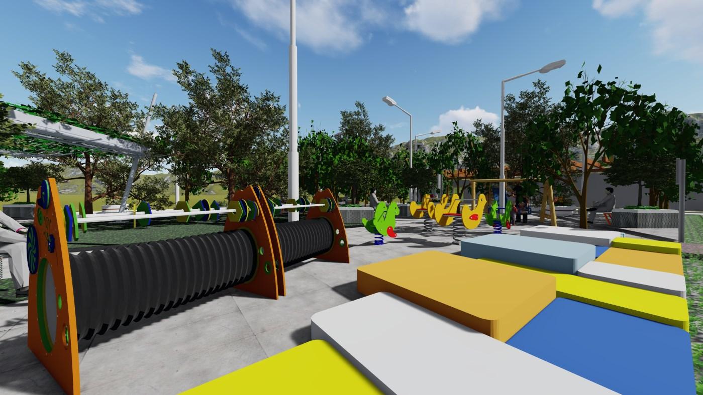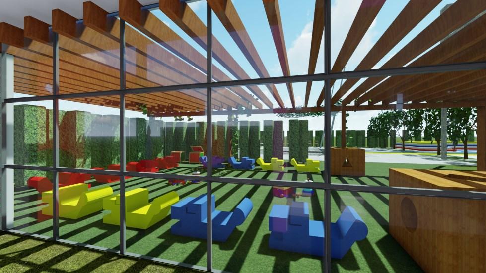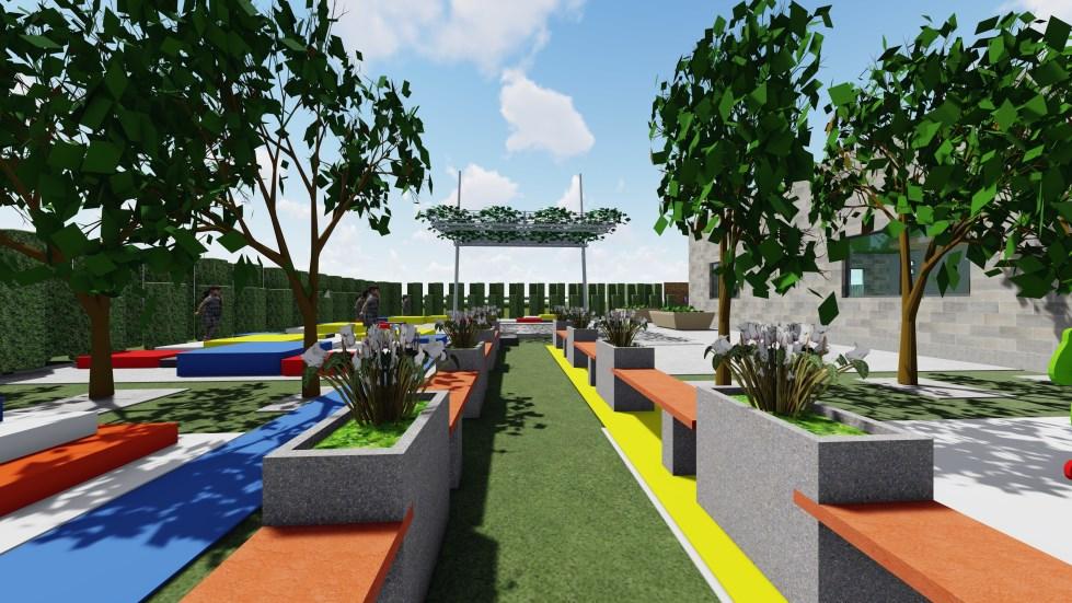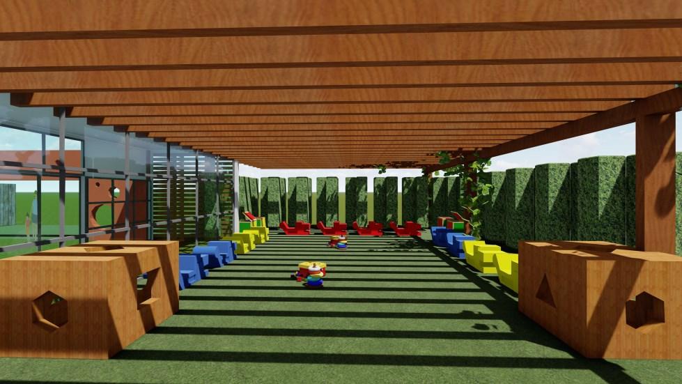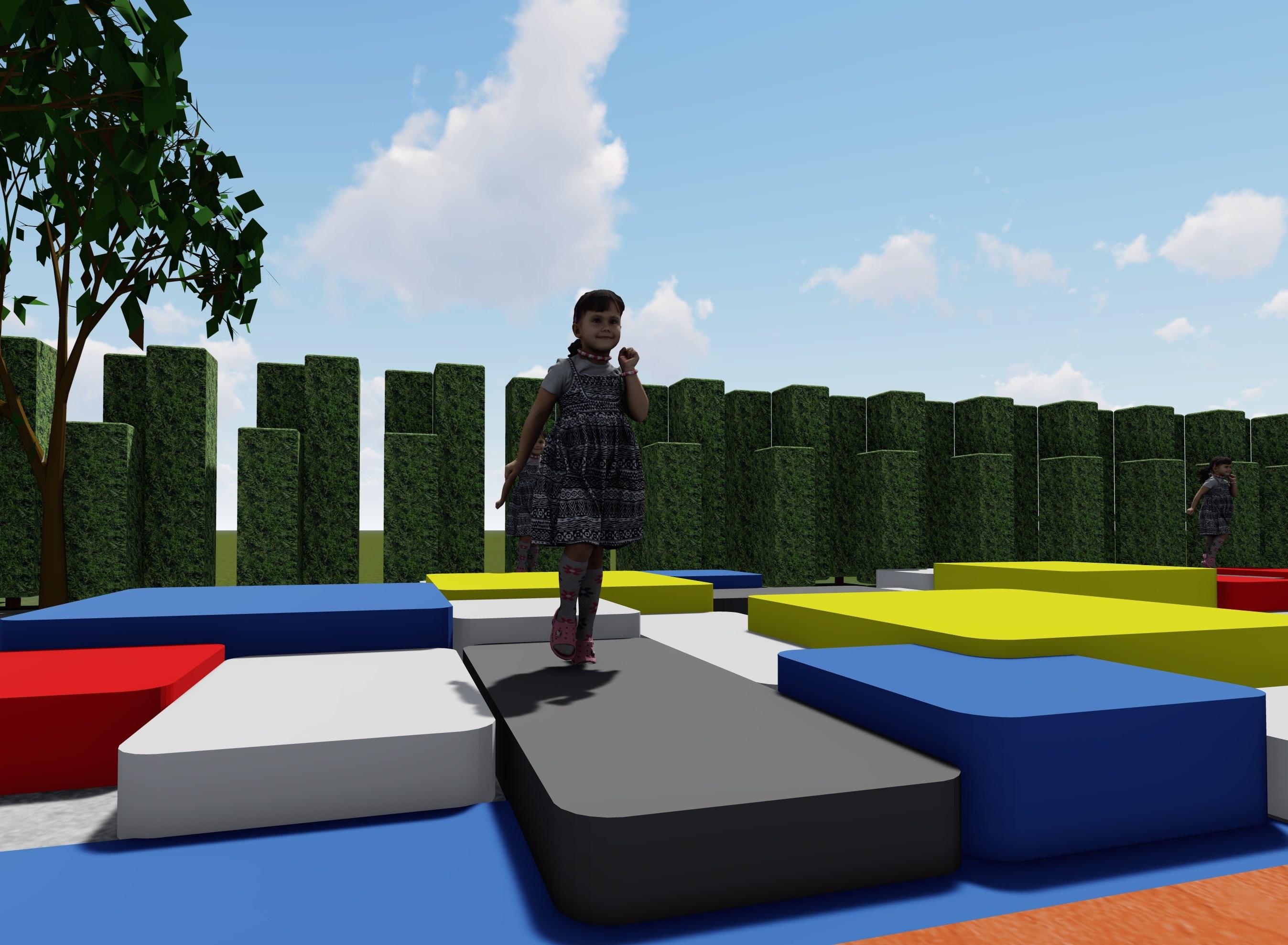 Diseño de áreas verdes de una UE, la propuesta plantea 3 áreas: programas escolares, recreativa y social. Destinado para niños entre 4 y 7 años, quienes están en etapa de descubrimiento Diseño de volúmenes superpuestos, con colores primarios