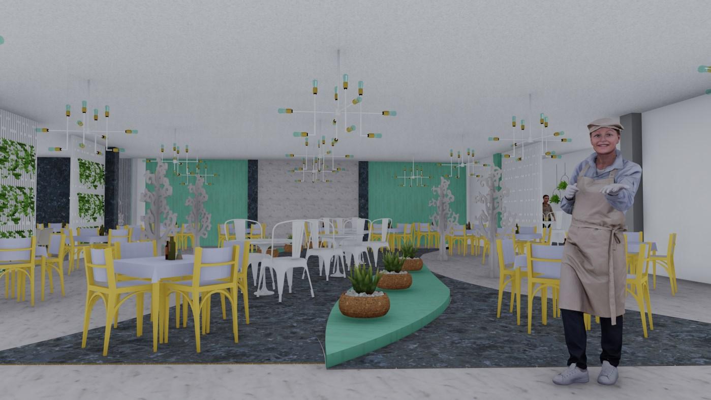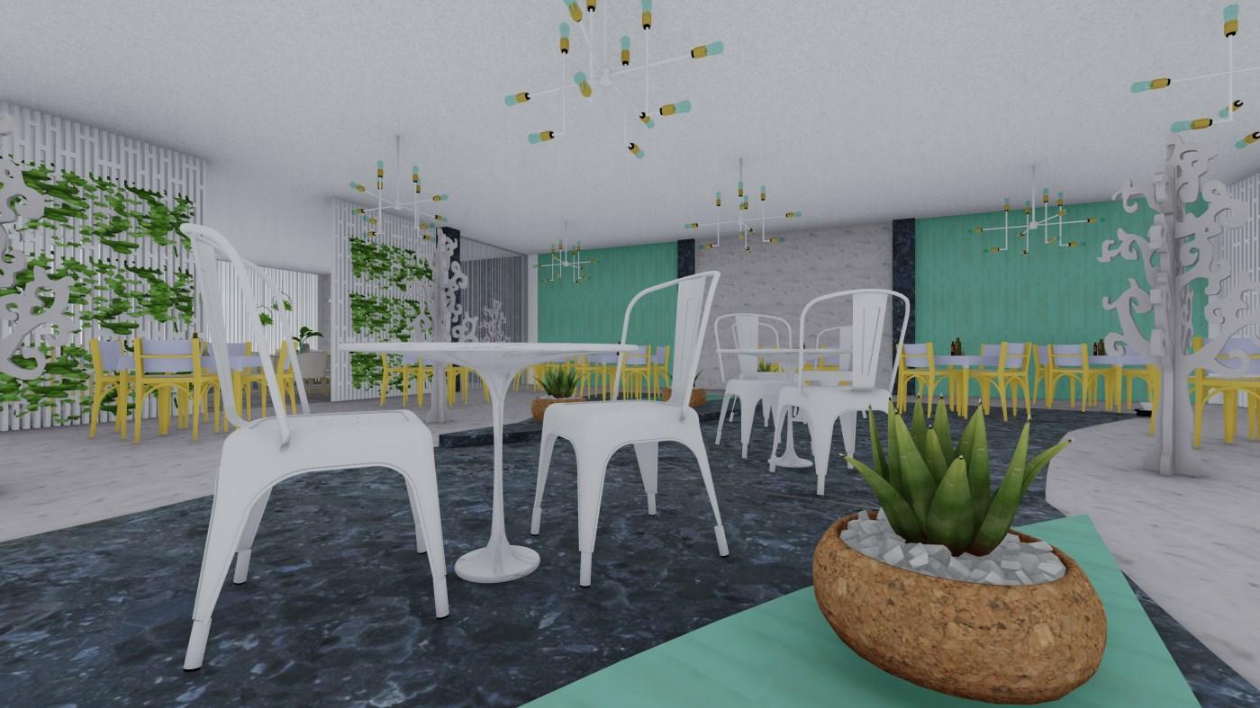 Diseño de espacio gastronómico para estudiantes de la Universidad de Guayaquil De estilo contemporáneo, cuenta con 3 zonas. Colorimetría aplicada de acuerdo al target, uso de 2 colores neutros con 3 colores que crean una visual armoniosa, además del uso de plantas para crear un espacio calmado.
