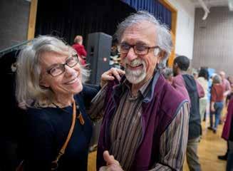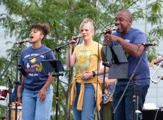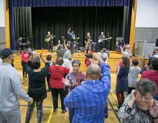Clockwise above: a Wirtz Center production; Jill Riddell offered empowering thinking about climate change at a Levy Lecture; Corky Siegel in a Levy Lecture presentation Clockwise opposite: Lynne Jordan performing at a Jamming Jean Concert (JJ); Crowd dancing at a JJ with Gerald McClendon; Suite Mollie at a summer JJ; Fran Randall Concert with Mezzo-soprano Naomi Brigell accompanied by Sarah Jenks; Dancing to South Boulevard Band
