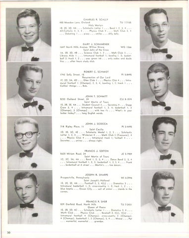 C H A R L ES R. SC A LLY .400 Meadow Lane, Oreland TU 7-7155 Holy Martyrs IB. 2E. 3D, 4A . . . Scholastic Letter I . . . Band I, 2. 3. 4 . , , All-Catholic 2, 3, 4 . . . Physics Club 4 . , . Math Club 3, 4 . . . Debating I . . . pious . . . smiles . . . dilly dally.