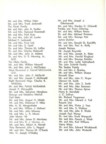 Mr. and Mrs. Joseph J. Orkwiszewski Mr. and Mrs. Stanley C. Orlowski Freddy and Franz Ostertag Mr. and Mrs. William Peters Dr. and Mrs. Michael Primiano Mr. and Mrs. George Putz James Quinlan Mr. and Mrs. Donald G. Ratcliffe Mr. and Mrs. Paul A. Reilly Joseph Reitano Mr. Joseph Reynolds Mr. and Mrs. Joseph A. Rider Mr. and Mrs. Harold Ringland Mr. and Mrs. George Roletter Mr. and Mrs. Leslie Schmalbach The John Schmitt Family The Seeber Family Mr. and Mrs J. Sharkey Mr. and Mrs. William Sharpe Kenneth Shaw Mr. and Mrs. John C. Singer Clement M. Smith Mr. and Mrs. John S. Smith Mr. and Mrs. Max Sorenson Mr. and Mrs. Thomas Spicer Harry B. Sternfield J. C. Sullivan Mr. Richard Tragemann Mr. and Mrs. Edward J. Turk Rosario Urzi Mr. and Mrs. Victor J. Voss Mr. and Mrs. S. Wallace Mr. and Mrs John E. Walsh Joseph Paul Wargo Dr. and Mrs. Frank W argocki Mr. and Mrs. Francis J. Wesh Mr. and Mrs. Karl Williams Harry Weiss Dr. and Mrs. Edward Wroblewski Mr. and Mrs. John Wudarski