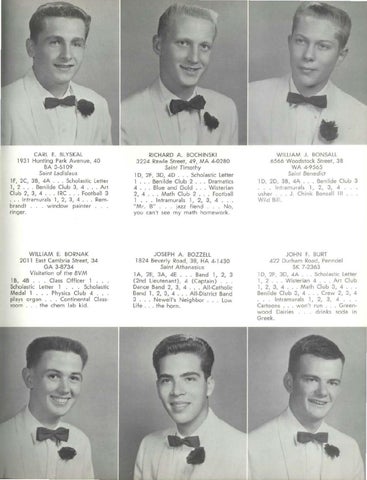 RICHARD A. BOCHINSKI 3224 Rawle Street, 49, MA 4-0280 Saint Timothy 1 D, 2F, 3D, 4D .. . Scholastic letter 1 . .. Benilde Club 2 . . . Dramatics 4 . . . Blue and Gold . . . Wisterian 2, 4 . . . Math Club 2 . . . Football 1 . . . lntramurals 1, 2, 3, 4 . . . "Mr. B" . . . jazz fiend . . . No, you can't see my math homewo rk.