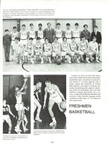 Labeled by many as the best freshman team in some time, this years frosh basketball team compiled an astounding record of 14 wins against only 2 loses. Under the direction of Coach Bob Walters, the team combined awsome rebounding with superior shooting ability to overpower many of their Catholic League opponents. As a result, La Salle will definitely develop into a power in the Catholic League as the members of the team of '74 mature to the varsity level.