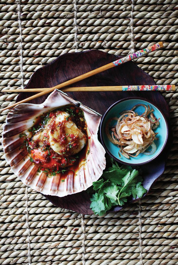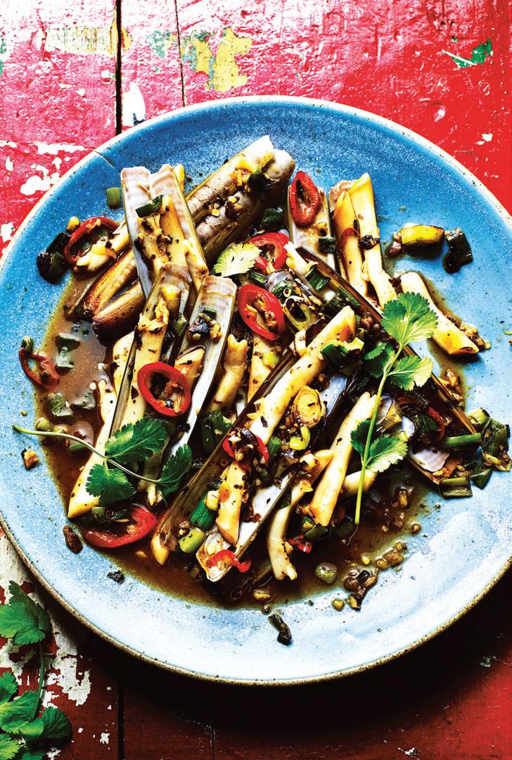 Serve immediately, garnished with the coriander leaves and a few of the blanched razor clam shells.