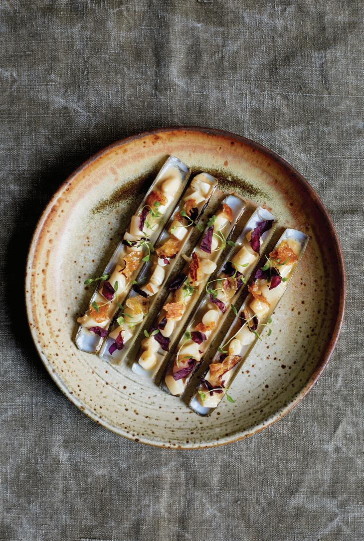 Spoon the clam meat into the shells. Dot the guanciale and dulse on top and garnish with micro celery.