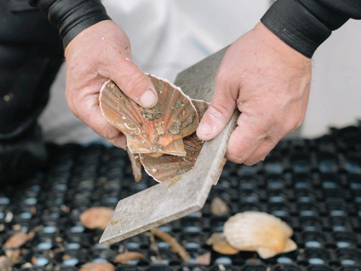 In the pocket of his suit, Darren carries a flare. “I’ve been lost at sea for seven hours before. I’m not letting that happen again,” he says grimly. Tied to his belt are the net bags he will fill with scallops then send to the surface, by attaching them to what is effectively an inflatable balloon. He’ll have an hour, he reckons, before the flood of the tide kicks. “I’ve been doing this since I was a teenager. I could go round after someone less experienced and pick up twice as many as they have done. You get what you call the eye, for scallops.” Even while picking up one unwitting shellfish off the sea floor, Darren has one eye scanning the seabed for his next find. A flicker of movement; the flash of an orange frill; even just a slight indentation in the sand can denote a piece of buried treasure.