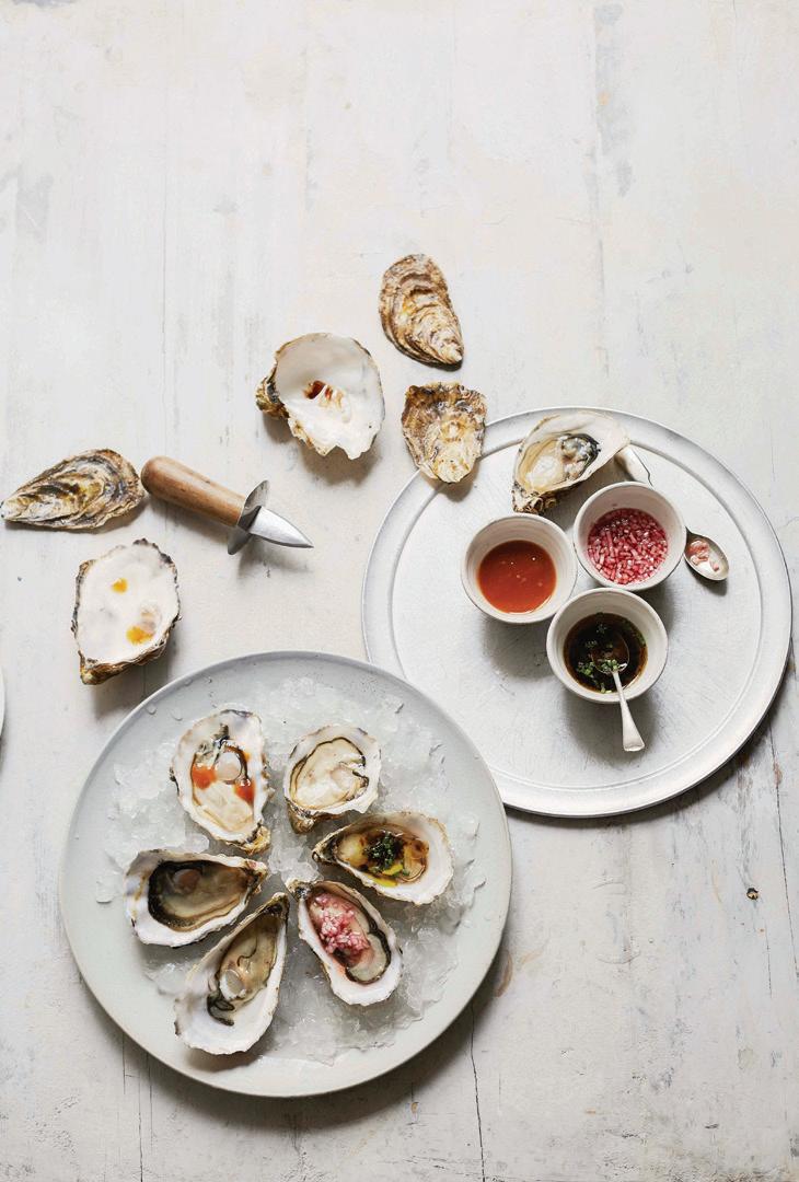 These three simple garnishes utilise striking condiments from around the Market (and will work equally well with either native oysters or rock oysters). Each garnish recipe makes enough for a dozen oysters.