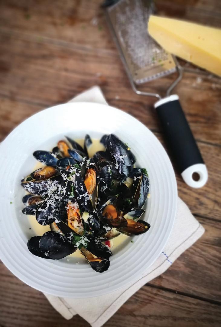 Just before serving add the cheddar and give the mussels a good stir and a final season –it may need a dash more cider, mustard or cream. Serve at once in warmed bowls.