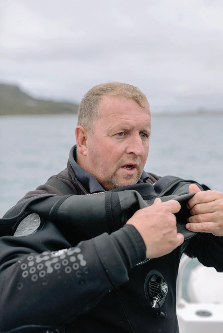 Slip is an understatement. With air cylinders, 32 pounds of weights around his waist and several baskets for collecting scallops, Darren’s entrance into the lolling sea is anything but slow. Even his suit is heavy: a thick, black skin of rubber. On his back, Darren is carrying my entire weight in tank, oxygen and mixed gases. “I’ll be working on 40 per cent oxygen today, which is twice as much oxygen as is in the air. That reduces my exposure to nitrogen which, if it becomes