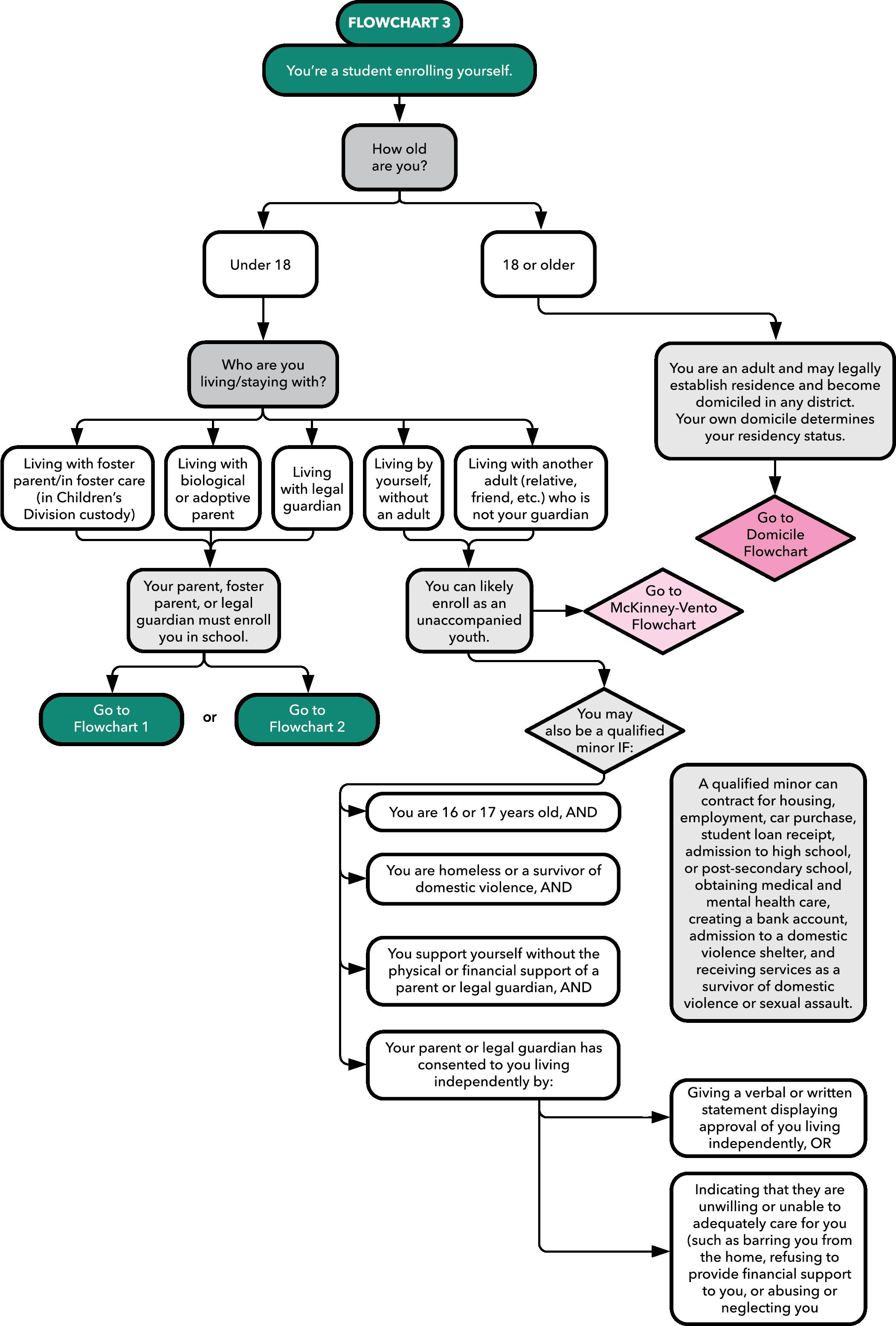 Under Missouri law, students 18 years or older are considered adults and may legally establish residence and become domiciled in any district within the state.50 Their residency status is determined by their own place of domicile, not that of their parents or legal guardians.51 Even for some students under 18, residency status can be determined by a student’s own place of domicile when they meet the criteria for “qualified minor” status.52 A “qualified minor” refers to someone who is 16 or 17 years old and does not have the support of a parent or guardian.53 They must meet specific criteria, such as experiencing homelessness or surviving domestic violence, and they cannot be under the supervision of the Children’s Division (e.g., in foster care) or under the jurisdiction of a juvenile court (e.g., in a residential juvenile facility).54 In addition, they will need consent from a parent or guardian.55 Consent can be provided as a verbal or written statement, or it can be implied by the actions of the parent or guardian.56 Implied consent can be established when a parent or guardian has abused the child, refused to provide financial support, or denied access to their home.57 A signed letter from a non-profit service provider, school employee (such as a school district liaison for homeless children, school counselor, or social worker), or an attorney representing the child can also serve as proof of implied consent.58 Once these requirements have been met, qualified minors can enroll themselves in a high school or postsecondary school.59